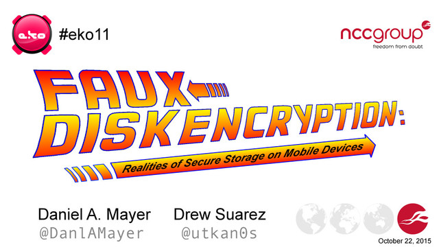 on Mobile Devices Who we are Daniel Mayer Principal Security Consultant with NCC Group Developer of idbtool.com, iOS pentesting tool Drew Suarez Senior Security Consultant, Research Director with NCC Group CyanogenMod (OSS) Device bringup / Wiki NCC Group UK Headquarters, Worldwide Offices Softare Escrow, Testing, Domain Services 2