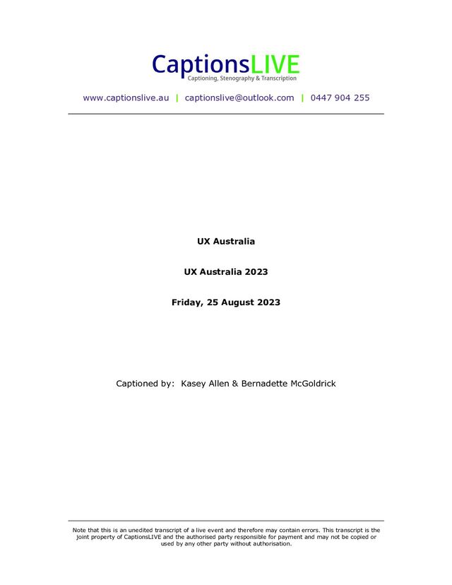 event and therefore may contain errors. This transcript is the joint property of CaptionsLIVE and the authorised party responsible for payment and may not be copied or used by any other party without authorisation. www.captionslive.au | [email protected] | 0447 904 255 UX Australia UX Australia 2023 Friday, 25 August 2023 Captioned by: Kasey Allen & Bernadette McGoldrick