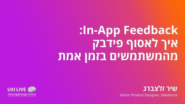 בהרצאה שיר תשתף בניסיון שלה בחווית הבנייה של in-app feedback בחברה גדולה ובקשיים שהיא נתקלה בהם. היא תציג כיצד התמודדו איתם בחברה ויצרו הנחיות שמובילות ליצירת in-app feedback שמותאם למטרות המוגדרות ועוזר לצוות ה-Design להיות ממוקד יותר בשאילת שאלות.