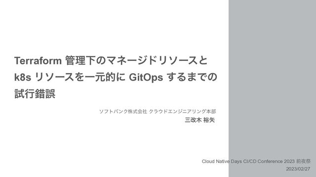 Terraform ཧԼͷϚωʔδυϦιʔεͱ k8s ϦιʔεΛҰݩతʹ GitOps ͢Δ·Ͱͷ ࢼߦࡨޡ 2023/02/27 ιϑτόϯΫגࣜձࣾ ΫϥυΤϯδχΞϦϯάຊ෦