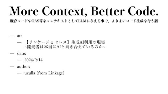 ⽣成 ⾏ 話 ̶ at: ̶ 【リンケージ x セレス】⽣成AI利⽤の現実 ~開発者は本当にAIと向き合えているのか~ ̶ date: ̶ 2024/9/14 ̶ author: ̶ uzulla (from Linkage)
