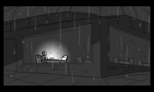 A storyboard for a short film. A rich man treats a poor man to a meal at a fancy restaurant and offers him a prince-and-the-pauper exchange with an alarming catch.