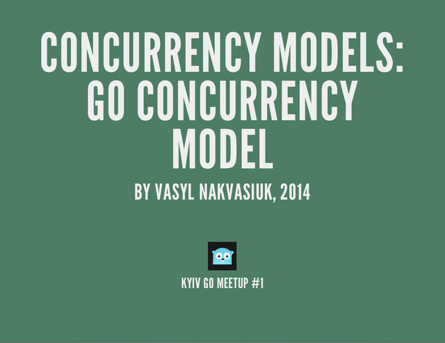 Paul Butcher “Communicating Sequential Processes”, 1978, C. A. R. Hoare OTHER: “Concurrency Is Not Parallelism” by Rob Pike ( ) “Modern Concurrency” by Alexey Kachayev ( ) A Tour of Go ( ) http://goo.gl/hyFmcZ http://goo.gl/Tr5USn http://tour.golang.org/