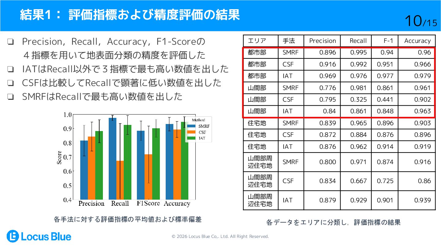 評価指標および精度評価の結果 ❏ Precision,Recall,Accuracy,F1-Scoreの 4指標を用いて地表面分類の精度を評価した ❏ IATはRecall以外で3指標で最も高い数値を出した ❏ CSFは比較してRecallで顕著に低い数値を出した ❏ SMRFはRecallで最も高い数値を出した 各手法に対する評価指標の平均値および標準偏差 各データをエリアに分類し,評価指標の結果 エリア 手法 Precision Recall F-1 Accuracy 都市部 SMRF 0.896 0.995 0.94 0.96 都市部 CSF 0.916 0.992 0.951 0.966 都市部 IAT 0.969 0.976 0.977 0.979 山間部 SMRF 0.776 0.981 0.861 0.961 山間部 CSF 0.795 0.325 0.441 0.902 山間部 IAT 0.84 0.861 0.848 0.963 住宅地 SMRF 0.839 0.965 0.896 0.903 住宅地 CSF 0.872 0.884 0.876 0.896 住宅地 IAT 0.876 0.962 0.914 0.919 山間部周 辺住宅地 SMRF 0.800 0.971 0.874 0.916 山間部周 辺住宅地 CSF 0.834 0.667 0.725 0.86 山間部周 辺住宅地 IAT 0.879 0.929 0.901 0.939 10/15
