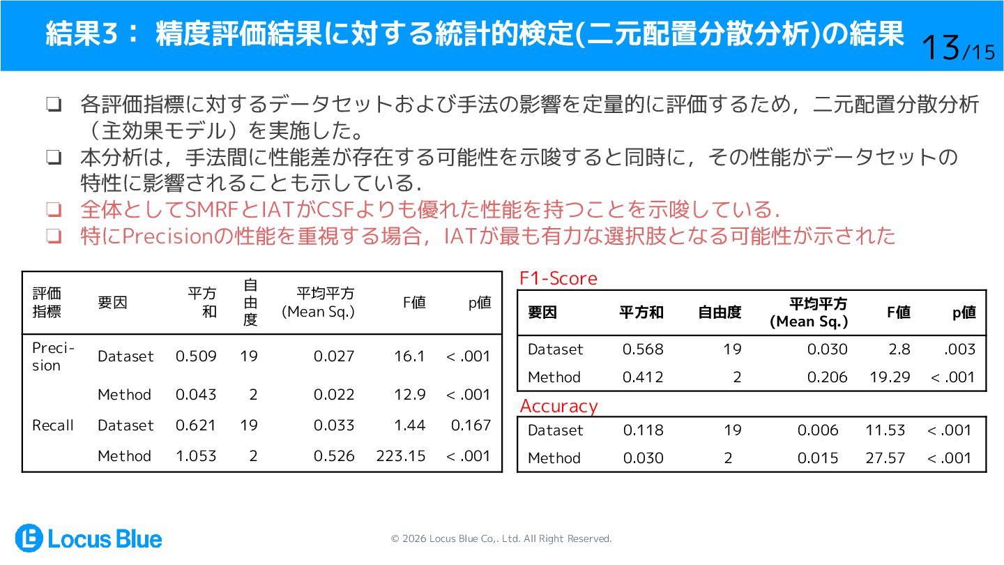 精度評価結果に対する統計的検定(二元配置分散分析)の結果 ❏ 各評価指標に対するデータセットおよび手法の影響を定量的に評価するため,二元配置分散分析 (主効果モデル)を実施した。 ❏ 本分析は,手法間に性能差が存在する可能性を示唆すると同時に,その性能がデータセットの 特性に影響されることも示している. ❏ 全体としてSMRFとIATがCSFよりも優れた性能を持つことを示唆している. ❏ 特にPrecisionの性能を重視する場合,IATが最も有力な選択肢となる可能性が示された F1-Score Accuracy 評価 指標 要因 平方 和 自 由 度 平均平方 (Mean Sq.) F値 p値 Preci- sion Dataset 0.509 19 0.027 16.1 < .001 Method 0.043 2 0.022 12.9 < .001 Recall Dataset 0.621 19 0.033 1.44 0.167 Method 1.053 2 0.526 223.15 < .001 要因 平方和 自由度 平均平方 (Mean Sq.) F値 p値 Dataset 0.568 19 0.030 2.8 .003 Method 0.412 2 0.206 19.29 < .001 Dataset 0.118 19 0.006 11.53 < .001 Method 0.030 2 0.015 27.57 < .001 13/15