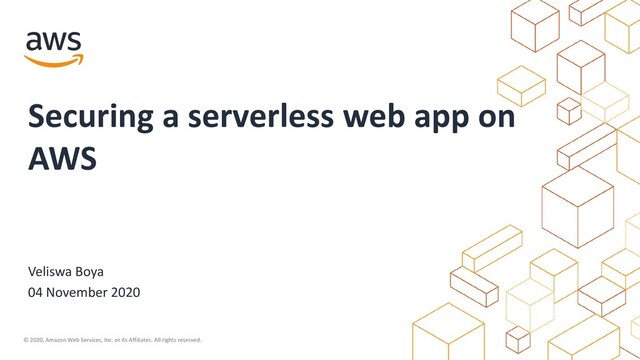 rights reserved. Security Patterns for Serverless architectures ❑ Protect against web attacks ❑ Authenticate access to web application ❑ Control access to APIs ❑ Secure storage of credentials ❑ Control access to AWS resources ❑ Protect against data loss