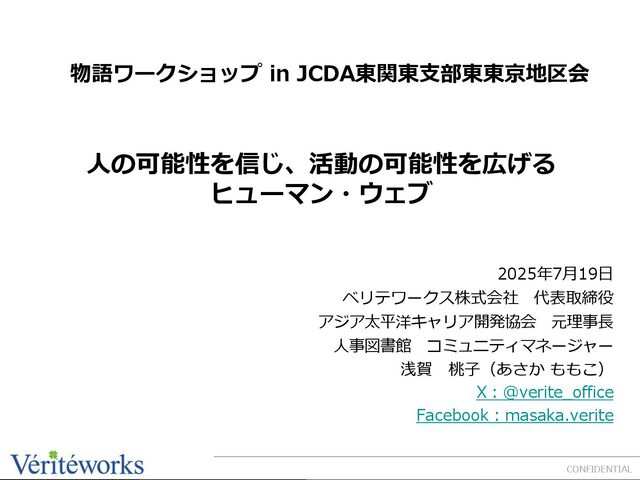 物語ワークショップ in JCDA東関東支部東東京地区会 人の可能性を信じ、活動の可能性を広げる ヒューマン・ウェブ 2025年7月19日 ベリテワークス株式会社 代表取締役 アジア太平洋キャリア開発協会 元理事長