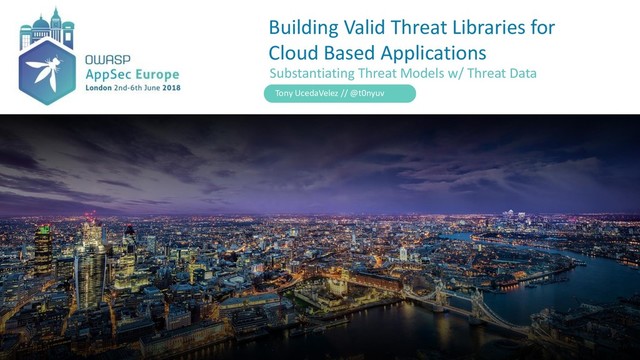 model can serve as blueprint for DevSecOps efforts across the FULL Cloud stack. • Remember Cloud can be SaaS, PaaS, IaaS, CaaS; Cloud is not just serverless apps, containers, or VMs. • Today, threats are often inferred from Attack Surfaces or Vulnerabilities. • Threats should point to viable attack patterns that can automated via automated testing. • Example: Crypto mining threat (aka cryptojacking) via priv escalation attack to instantiate new EC2 instance • “Threat Hunting” has completely perversed the use of threat intelligence. • Reboot & refactor needed to iteratively feed threat models. • Threat data may represent lessons learned from prior battles/ attacks logged in Cloud management logs, VMs, serverless apps Clarifying Threat Terms Use & Abuses Tony UcedaVelez // @t0nyuv Threats Against Cloud Castles – Key Threat Modeling Points to Consider
