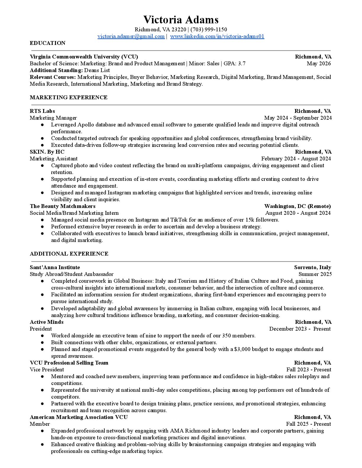 www.linkedin.com/in/victoria-adams01 EDUCATION Virginia Commonwealth University (VCU) Richmond, VA Bachelor of Science: Marketing: Brand and Product Management | Minor: Sales | GPA: 3.7 May 2026 Additional Standing: Deans List Relevant Courses: Marketing Principles, Buyer Behavior, Marketing Research, Digital Marketing, Brand Management, Social Media Research, International Marketing, Marketing and Brand Strategy. MARKETING EXPERIENCE RTS Labs Richmond, VA Marketing Manager May 2024 - September 2024 • Leveraged Apollo database and advanced email software to generate qualified leads and improve digital outreach performance. • Conducted targeted outreach for speaking opportunities and global conferences, strengthening brand visibility. • Executed data-driven follow-up strategies increasing lead conversion rates and securing potential clients. SKIN. By HC Richmond, VA Marketing Assistant February 2024 - August 2024 • Captured photo and video content reflecting the brand on multi-platform campaigns, driving engagement and client retention. • Supported planning and execution of in-store events, coordinating marketing efforts and creating content to drive attendance and engagement. • Designed and managed Instagram marketing campaigns that highlighted services and trends, increasing online visibility and client inquiries. The Beauty Matchmakers Washington, DC (Remote) Social Media/Brand Marketing Intern August 2020 - August 2024 • Managed social media presence on Instagram and TikTok for an audience of over 15k followers. • Performed extensive buyer research in order to ascertain and develop a business strategy. • Collaborated with executives to launch brand initiatives, strengthening skills in communication, project management, and digital marketing. ADDITIONAL EXPERIENCE Sant’Anna Institute Sorrento, Italy Study Abroad/Student Ambassador Summer 2025 • Completed coursework in Global Business: Italy and Tourism and History of Italian Culture and Food, gaining cross-cultural insights into international markets, consumer behavior, and the intersection of culture and commerce. • Facilitated an information session for student organizations, sharing first-hand experiences and encouraging peers to pursue international study. • Developed adaptability and global awareness by immersing in Italian culture, engaging with local businesses, and analyzing how cultural traditions influence branding, marketing, and consumer decision-making. Active Minds Richmond, VA President December 2023 - Present • Worked alongside an executive team of nine to support the needs of our 350 members. • Built connections with other clubs, organizations, or external partners. • Planned and staged promotional events suggested by the general body with a $3,000 budget to engage students and spread awareness. VCU Professional Selling Team Richmond, VA Vice President Fall 2023 - Present • Mentored and coached new members, improving team performance and confidence in high-stakes sales roleplays and competitions. • Represented the university at national multi-day sales competitions, placing among top performers out of hundreds of competitors. • Partnered with the executive board to design training plans, practice sessions, and promotional strategies, enhancing recruitment and team recognition across campus. American Marketing Association VCU Richmond, VA Member Fall 2025 - Present • Expanded professional network by engaging with AMA Richmond industry leaders and corporate partners, gaining hands-on exposure to cross-functional marketing practices and digital innovations. • Enhanced creative thinking and problem-solving skills by brainstorming campaign strategies and engaging with professionals on cutting-edge marketing topics.