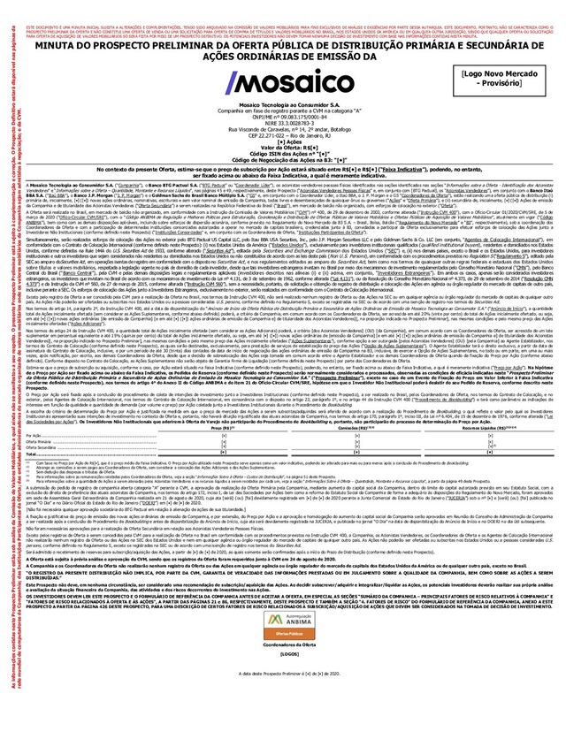 Comissão de Valores Mobiliários, a qual ainda não se manifestou a seu respeito. O presente Prospecto Preliminar está sujeito à complementação e correção. O Prospecto Definitivo estará disponível nas páginas da rede mundial de computadores da Companhia; das Instituições Participantes da Oferta; das entidades administradoras de mercado organizado de valores mobiliários onde os valores mobiliários da Companhia sejam admitidos à negociação; e da CVM. ESTE DOCUMENTO É UMA MINUTA INICIAL SUJEITA A ALTERAÇÕES E COMPLEMENTAÇÕES, TENDO SIDO ARQUIVADO NA COMISSÃO DE VALORES MOBILIÁRIOS PARA FINS EXCLUSIVOS DE ANÁLISE E EXIGÊNCIAS POR PARTE DESSA AUTARQUIA. ESTE DOCUMENTO, PORTANTO, NÃO SE CARACTERIZA COMO O PROSPECTO PRELIMINAR DA OFERTA E NÃO CONSTITUI UMA OFERTA DE VENDA OU UMA SOLICITAÇÃO PARA OFERTA DE COMPRA DE TÍTULOS E VALORES MOBILIÁRIOS NO BRASIL, NOS ESTADOS UNIDOS DA AMÉRICA OU EM QUALQUER OUTRA JURISDIÇÃO, SENDO QUE QUALQUER OFERTA OU SOLICITAÇÃO PARA OFERTA DE AQUISIÇÃO DE VALORES MOBILIÁRIOS SÓ SERÁ FEITA POR MEIO DE UM PROSPECTO DEFINITIVO. OS POTENCIAIS INVESTIDORES NÃO DEVEM TOMAR NENHUMA DECISÃO DE INVESTIMENTO COM BASE NAS INFORMAÇÕES CONTIDAS NESTA MINUTA. MINUTA DO PROSPECTO PRELIMINAR DA OFERTA PÚBLICA DE DISTRIBUIÇÃO PRIMÁRIA E SECUNDÁRIA DE AÇÕES ORDINÁRIAS DE EMISSÃO DA Mosaico Tecnologia ao Consumidor S.A. Companhia em fase de registro perante a CVM na categoria “A” CNPJ/ME nº 09.083.175/0001-84 NIRE 33.3.0028783-3 Rua Visconde de Caravelas, nº 14, 2º andar, Botafogo CEP 22.271-022 – Rio de Janeiro, RJ [•] Ações Valor da Oferta: R$[•] Código ISIN das Ações nº “[•]” Código de Negociação das Ações na B3: “[•]” No contexto da presente Oferta, estima-se que o preço de subscrição por Ação estará situado entre R$[•] e R$[•] (“Faixa Indicativa”), podendo, no entanto, ser fixado acima ou abaixo da Faixa Indicativa, a qual é meramente indicativa. A Mosaico Tecnologia ao Consumidor S.A. (“Companhia”), o Banco BTG Pactual S.A. (“BTG Pactual” ou “Coordenador Líder”), os acionistas vendedores pessoas físicas identificados nas seções identificados nas seções “Informações sobre a Oferta - Identificação dos Acionistas Vendedores” e “Informações sobre a Oferta – Quantidade, Montante e Recursos Líquidos”, nas páginas 45 e 49, respectivamente, deste Prospecto (“Acionistas Vendedores Pessoas Físicas” e, em conjunto com [BTG Pactual], os “Acionistas Vendedores”), em conjunto com o Banco Itaú BBA S.A. (“Itaú BBA”), o Banco J.P. Morgan (“J. P. Morgan”) e o Goldman Sachs do Brasil Banco Múltiplo S.A. (“GS” e, em conjunto com o Coordenador Líder, o Itaú BBA, o J. P. Morgan e o GS “Coordenadores da Oferta”), estão realizando uma oferta pública de distribuição (i) primária de, inicialmente, [•] ([•]) novas ações ordinárias, nominativas, escriturais e sem valor nominal de emissão da Companhia, todas livres e desembaraçadas de quaisquer ônus ou gravames (“Ações” e “Oferta Primária”), e (ii) secundária de, inicialmente, [•] ([•]) Ações de emissão da Companhia e de titularidade dos Acionistas Vendedores (“Oferta Secundária”) a serem realizadas na República Federativa do Brasil (“Brasil”), em mercado de balcão não organizado, com esforços de colocação no exterior (“Oferta”). A Oferta será realizada no Brasil, em mercado de balcão não organizado, em conformidade com a Instrução da Comissão de Valores Mobiliários (“CVM”) nº 400, de 29 de dezembro de 2003, conforme alterada (“Instrução CVM 400”), com o Ofício-Circular 01/2020/CVM/SRE, de 5 de março de 2020 (“Ofício-Circular CVM/SRE”), com o “Código ANBIMA de Regulação e Melhores Práticas para Estruturação, Coordenação e Distribuição de Ofertas Públicas de Valores Mobiliários e Ofertas Públicas de Aquisição de Valores Mobiliários”, atualmente em vigor (“Código ANBIMA”), bem como com as demais disposições aplicáveis, incluindo sobre esforços de dispersão acionária, conforme previsto no Regulamento do Novo Mercado da B3 S.A. – Brasil, Bolsa, Balcão (“Regulamento do Novo Mercado” e “B3”, respectivamente), sob a coordenação dos Coordenadores da Oferta e com a participação de determinadas instituições consorciadas autorizadas a operar no mercado de capitais brasileiro, credenciadas junto à B3, convidadas a participar da Oferta exclusivamente para efetuar esforços de colocação das Ações junto a Investidores Não Institucionais (conforme definido neste Prospecto) (“Instituições Consorciadas” e, em conjunto com os Coordenadores da Oferta, “Instituições Participantes da Oferta”). Simultaneamente, serão realizados esforços de colocação das Ações no exterior pelo BTG Pactual US Capital LLC, pelo Itau BBA USA Securities, Inc., pelo J.P. Morgan Securities LLC e pelo Goldman Sachs & Co. LLC (em conjunto, “Agentes de Colocação Internacional”), em conformidade com o Contrato de Colocação Internacional (conforme definido neste Prospecto): (i) nos Estados Unidos da América (“Estados Unidos”), exclusivamente para investidores institucionais qualificados (qualified institutional buyers), residentes e domiciliados nos Estados Unidos, conforme definidos na Rule 144A do U.S. Securities Act de 1933, conforme alterado (“Securities Act”), editada pela Securities and Exchange Commission dos Estados Unidos (“SEC”) e, (ii) nos demais países, exceto o Brasil e os Estados Unidos, para investidores institucionais e outros investidores que sejam considerados não residentes ou domiciliados nos Estados Unidos ou não constituídos de acordo com as leis deste país (Non U.S. Persons), em conformidade com os procedimentos previstos no Regulation S (“Regulamento S”), editado pela SEC ao amparo doSecurities Act, em operações isentas de registro em c