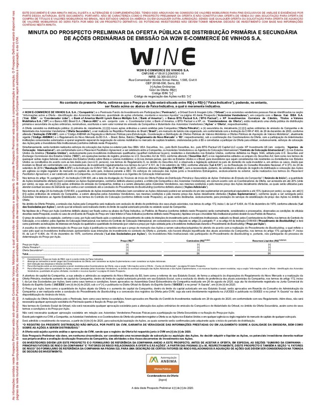 Comissão de Valores Mobiliários, a qual ainda não se manifestou a seu respeito. O presente Prospecto Preliminar está sujeito à complementação e correção. O Prospecto Definitivo estará disponível nas páginas da rede mundial de computadores da Companhia; das Instituições Participantes da Oferta; das entidades administradoras de mercado organizado de valores mobiliários onde os valores mobiliários da Companhia sejam admitidos à negociação; e da CVM. ESTE DOCUMENTO É UMA MINUTA INICIAL SUJEITA A ALTERAÇÕES E COMPLEMENTAÇÕES, TENDO SIDO ARQUIVADO NA COMISSÃO DE VALORES MOBILIÁRIOS PARA FINS EXCLUSIVOS DE ANÁLISE E EXIGÊNCIAS POR PARTE DESSA AUTARQUIA. ESTE DOCUMENTO, PORTANTO, NÃO SE CARACTERIZA COMO O PROSPECTO PRELIMINAR DA OFERTA E NÃO CONSTITUI UMA OFERTA DE VENDA OU UMA SOLICITAÇÃO PARA OFERTA DE COMPRA DE TÍTULOS E VALORES MOBILIÁRIOS NO BRASIL, NOS ESTADOS UNIDOS DA AMÉRICA OU EM QUALQUER OUTRA JURISDIÇÃO, SENDO QUE QUALQUER OFERTA OU SOLICITAÇÃO PARA OFERTA DE AQUISIÇÃO DE VALORES MOBILIÁRIOS SÓ SERÁ FEITA POR MEIO DE UM PROSPECTO DEFINITIVO. OS POTENCIAIS INVESTIDORES NÃO DEVEM TOMAR NENHUMA DECISÃO DE INVESTIMENTO COM BASE NAS INFORMAÇÕES CONTIDAS NESTA MINUTA. MINUTA DO PROSPECTO PRELIMINAR DA OFERTA PÚBLICA DE DISTRIBUIÇÃO PRIMÁRIA E SECUNDÁRIA DE AÇÕES ORDINÁRIAS DE EMISSÃO DA W2W E-COMMERCE DE VINHOS S.A. W2W E-COMMERCE DE VINHOS S.A. CNPJ/ME nº 09.813.204/0001-16 NIRE: 32.300.033.512 Rua Comendador Alcides Simao Helou, 1.565, Civit II CEP 29168-090, Serra, ES [•] Ações Ordinárias Valor da Oferta: R$[•] Código ISIN: “[•]” Código de negociação das Ações na B3: “[•]” No contexto da presente Oferta, estima-se que o Preço por Ação estará situado entre R$[•] e R$[•] (“Faixa Indicativa”), podendo, no entanto, ser fixado acima ou abaixo da Faixa Indicativa, a qual é meramente indicativa. A W2W E-COMMERCE DE VINHOS S.A. S.A. (“Companhia”) e o Península Fundo de Investimento em Participações (“Península”), a Orbeat Som & Imagem Ltda. (“Orbeat”) e os acionistas vendedores pessoas físicas identificados na seção “Informações sobre a Oferta - Identificação dos Acionistas Vendedores, quantidade de ações ofertadas, montante e recursos líquidos” na página 46 deste Prospecto (“Acionistas Vendedores”), em conjunto com o Banco Itaú BBA S.A. (“Itaú BBA” ou “Coordenador Líder”), o Bank of America Merrill Lynch Banco Múltiplo S.A. (“Bank of America”), o Banco BTG Pactual S.A. (“BTG Pactual”), a XP Investimentos Corretora de Câmbio, Títulos e Valores Mobiliários S.A. (“XP”) e o Banco ABC Brasil S.A. (“Banco ABC” e, em conjunto com o Coordenador Líder, o Bank of America, o BTG Pactual e a XP, os “Coordenadores da Oferta”), estão realizando uma oferta pública de distribuição primária e secundária de ações ordinárias, nominativas, escriturais e sem valor nominal de emissão da Companhia e titularidade dos Acionistas Vendedores (“Ações” e “Oferta”, respectivamente). A Oferta consistirá na distribuição pública: (i) primária de, inicialmente, [•] ([•]) novas ações ordinárias a serem emitidas pela Companhia (“Oferta Primária”); e (ii) secundária de, inicialmente, [•] ([•]) ações ordinárias de emissão da Companhia e de titularidade dos Acionistas Vendedores (“Oferta Secundária”), a ser realizada na República Federativa do Brasil (“Brasil”), em mercado de balcão não organizado, em conformidade com a Instrução da CVM nº 400, de 29 de dezembro de 2003, conforme alterada (“Instrução CVM 400”), com o “Código ANBIMA de Regulação e Melhores Práticas para Estruturação, Coordenação e Distribuição de Ofertas Públicas de Valores Mobiliários e Ofertas Públicas de Aquisição de Valores Mobiliários”, atualmente vigente (“Código ANBIMA”) e o Regulamento do Novo Mercado da B3 S.A. – Brasil, Bolsa, Balcão (“Regulamento do Novo Mercado” e “B3”, respectivamente), sob a coordenação dos Coordenadores da Oferta, com a participação de determinadas instituições consorciadas autorizadas a operar segmento especial de negociação de valores mobiliários no mercado de capitais brasileiro, credenciadas junto à B3 e convidadas a participar da Oferta para efetuar, exclusivamente, esforços de colocação das Ações junto a Investidores Não Institucionais (conforme definido neste Prospecto). Simultaneamente, serão também realizados esforços de colocação das Ações no exterior pelo Itau BBA USA Securities, Inc., pelo BofA Securities, Inc., pelo BTG Pactual US Capital LLC e pela XP Investments US (em conjunto, “Agentes de Colocação Internacional”), em conformidade com o Placement Facilitation Agreement, a ser celebrado entre a Companhia, os Acionistas Vendedores e os Agentes de Colocação Internacional (“Contrato de Colocação Internacional”): (i) nos Estados Unidos da América (“Estados Unidos”), exclusivamente para investidores institucionais qualificados (qualified institutional buyers), residentes e domiciliados nos Estados Unidos, conforme definidos na Regra 144A, editada pela U.S. Securities and Exchange Commission dos Estados Unidos (“SEC”), em operações isentas de registro, previstas no U.S. Securities Act de 1933, conforme alterado (“Securities Act”) e nos regulamentos editados ao amparo do Securities Act, bem como nos termos de quaisquer outras regras federais e estaduais dos Estados Unidos sobre títulos e valores mobiliários; e (ii) nos demais países, que não os Estados Unidos e o Brasil, para investidores que sejam considerados não residentes ou domiciliados nos Estados Unidos ou constituídos de acordo com as leis deste país (non-U.S. persons), nos termos do Regulamento S, no âmbito do Securities Act, e observada a legislação aplicável no país de domicílio de cada investidor e, em ambos os casos, desde que invista