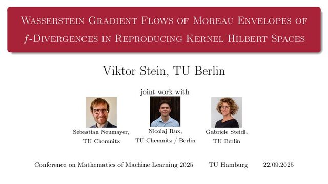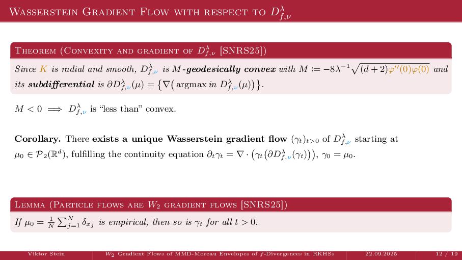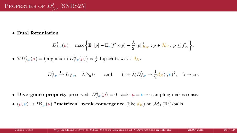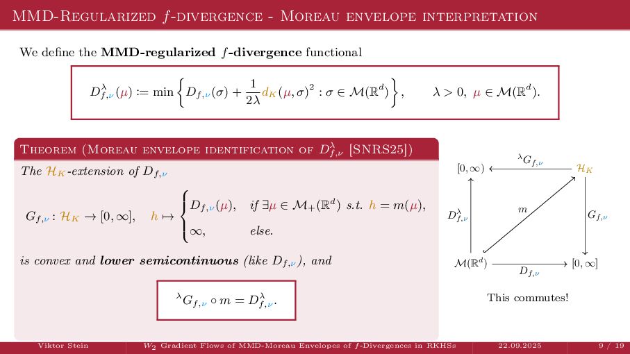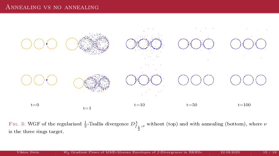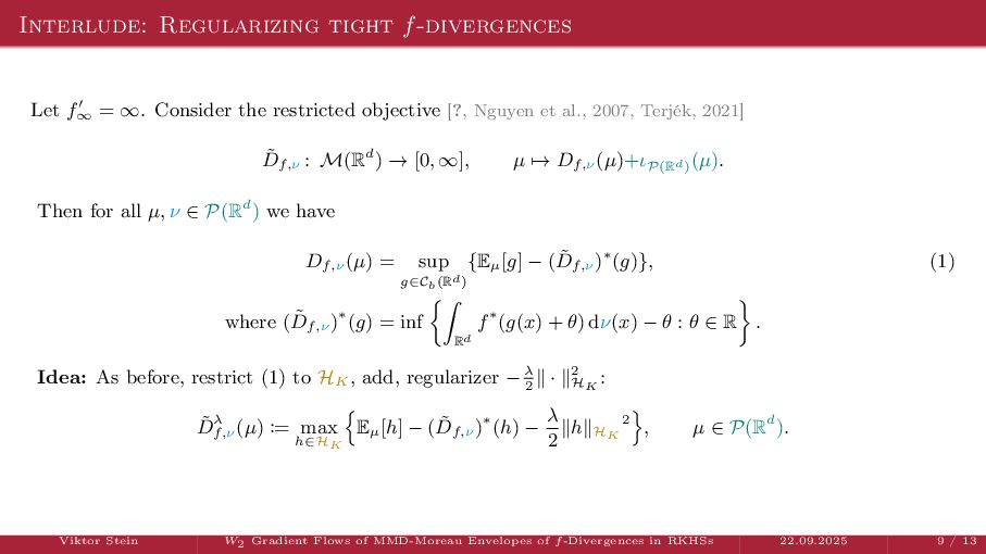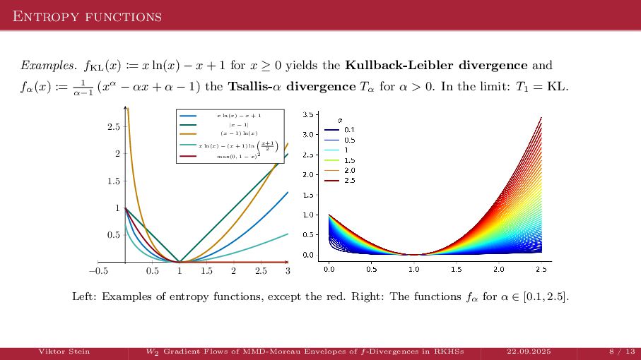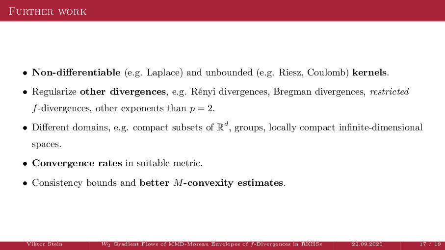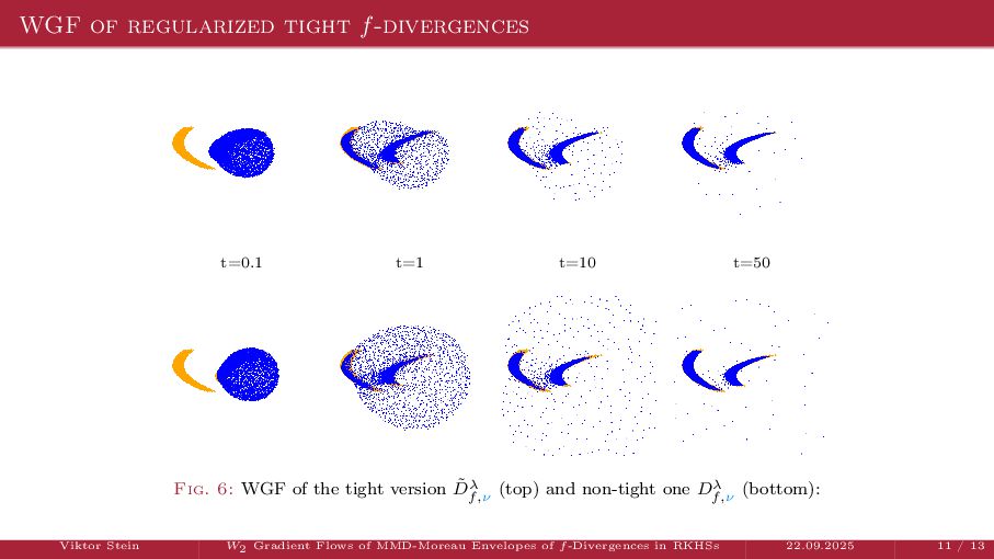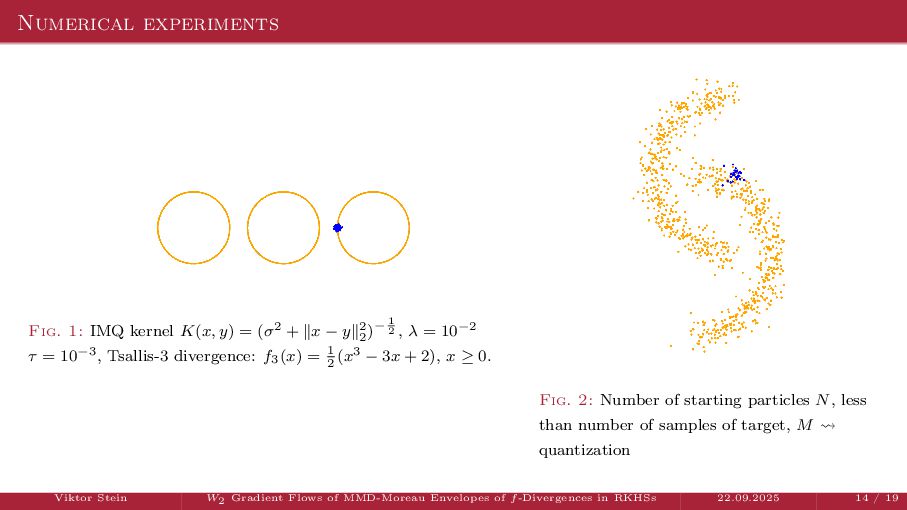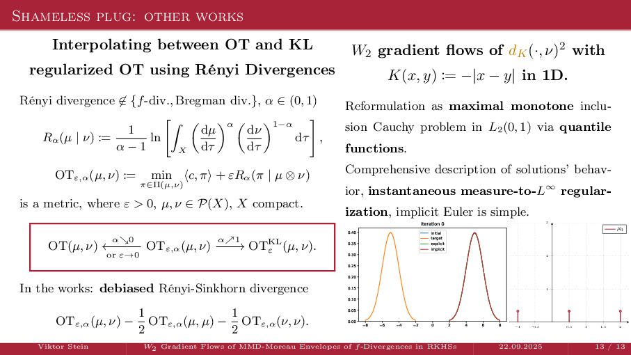 OT using Rényi Divergences Rényi divergence ̸∈ {f-div., Bregman div.}, α ∈ (0, 1) Rα (µ | ν) := 1 α − 1 ln X dµ dτ α dν dτ 1−α dτ , OTε,α (µ, ν) := min π∈Π(µ,ν) ⟨c, π⟩ + εRα (π | µ ⊗ ν) is a metric, where ε > 0, µ, ν ∈ P(X), X compact. OT(µ, ν) α↘0 ← − − − − or ε→0 OTε,α (µ, ν) α↗1 − − − → OTKL ε (µ, ν). In the works: debiased Rényi-Sinkhorn divergence OTε,α (µ, ν) − 1 2 OTε,α (µ, µ) − 1 2 OTε,α (ν, ν). W2 gradient flows of dK (·, ν)2 with K(x, y) := −|x − y| in 1D. Reformulation as maximal monotone inclu- sion Cauchy problem in L2 (0, 1) via quantile functions. Comprehensive description of solutions’ behav- ior, instantaneous measure-to-L∞ regular- ization, implicit Euler is simple. Viktor Stein W2 Gradient Flows of MMD-Moreau Envelopes of f-Divergences in RKHSs 22.09.2025 13 / 13 −1 −0.5 0.5 1 1.5 2 1 2 3 µ0 8 6 4 2 0 2 4 6 8 0.00 0.05 0.10 0.15 0.20 0.25 0.30 0.35 0.40 Iteration 0 initial target explicit implicit