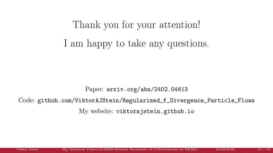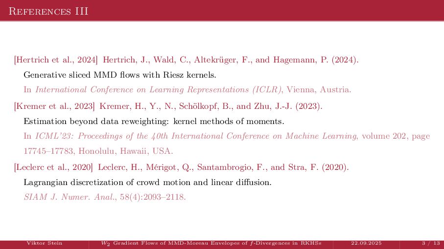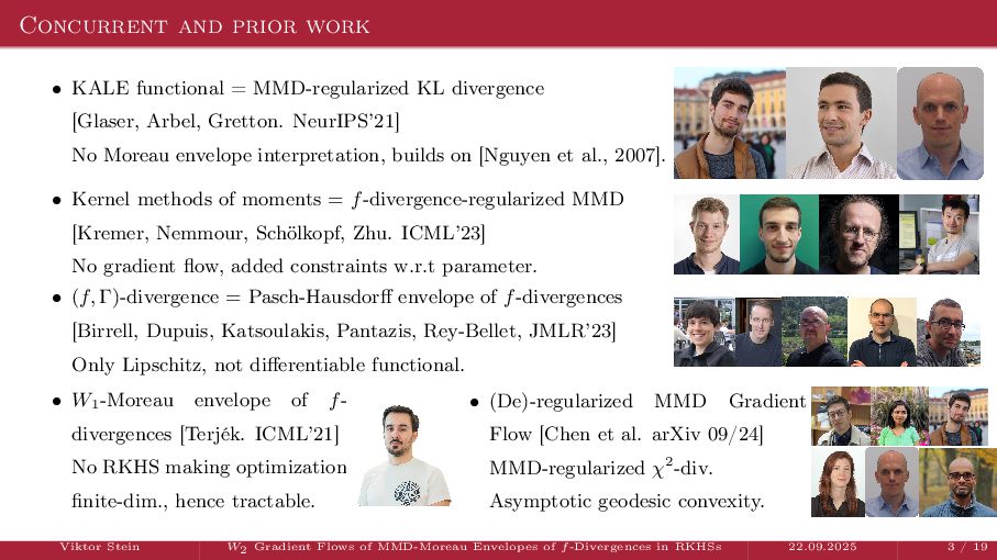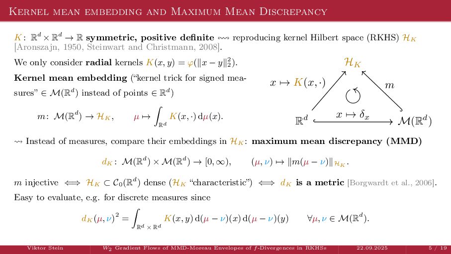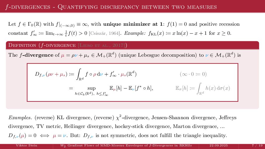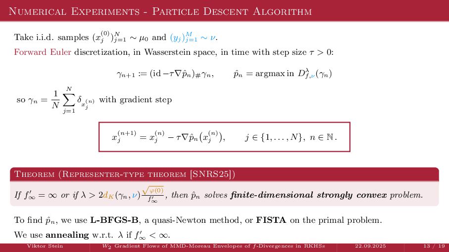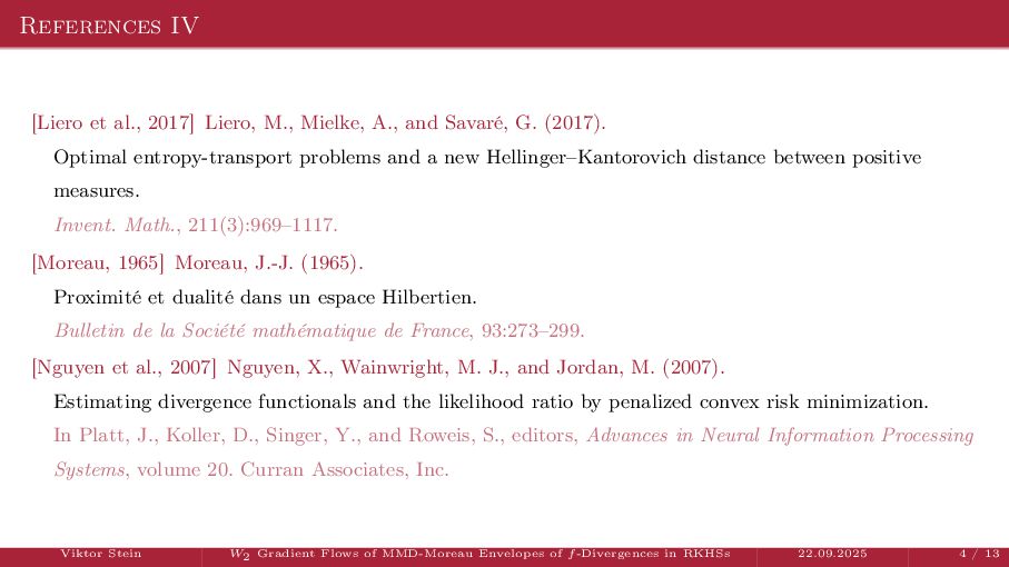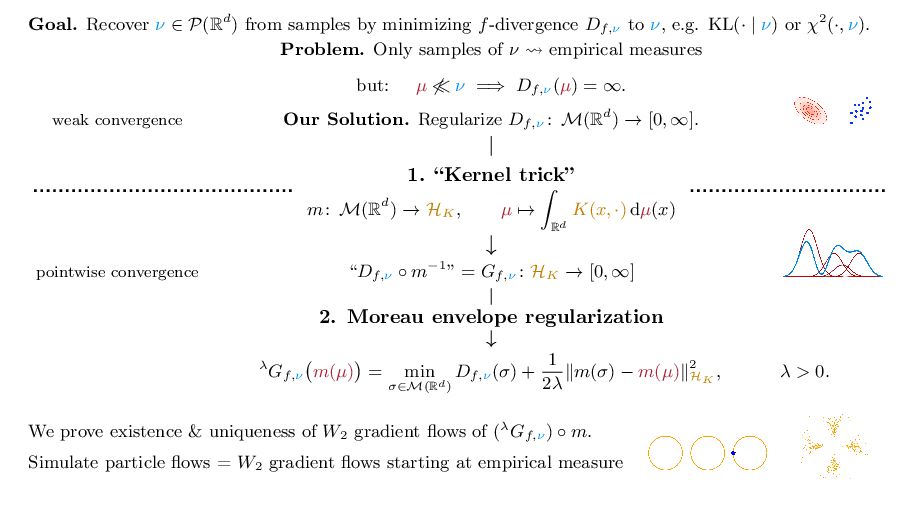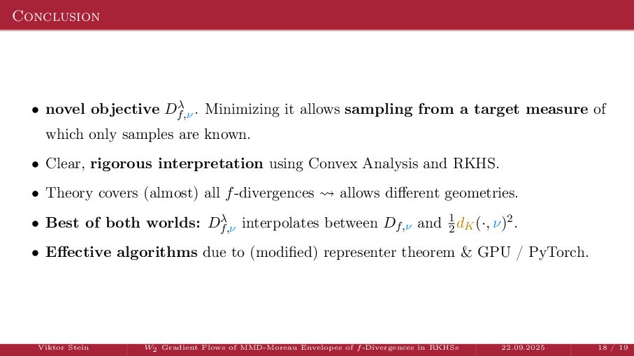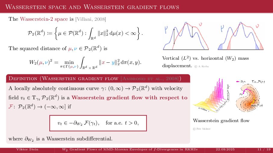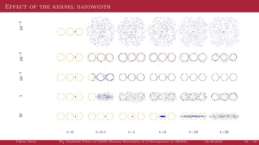 OT using Rényi Divergences Rényi divergence ̸∈ {f-div., Bregman div.}, α ∈ (0, 1) Rα (µ | ν) := 1 α − 1 ln X dµ dτ α dν dτ 1−α dτ , OTε,α (µ, ν) := min π∈Π(µ,ν) ⟨c, π⟩ + εRα (π | µ ⊗ ν) is a metric, where ε > 0, µ, ν ∈ P(X), X compact. OT(µ, ν) α↘0 ← − − − − or ε→0 OTε,α (µ, ν) α↗1 − − − → OTKL ε (µ, ν). In the works: debiased Rényi-Sinkhorn divergence OTε,α (µ, ν) − 1 2 OTε,α (µ, µ) − 1 2 OTε,α (ν, ν). W2 gradient flows of dK (·, ν)2 with K(x, y) := −|x − y| in 1D. Reformulation as maximal monotone inclu- sion Cauchy problem in L2 (0, 1) via quantile functions. Comprehensive description of solutions’ behav- ior, instantaneous measure-to-L∞ regular- ization, implicit Euler is simple. Viktor Stein W2 Gradient Flows of MMD-Moreau Envelopes of f-Divergences in RKHSs 22.09.2025 13 / 13 −1 −0.5 0.5 1 1.5 2 1 2 3 µ0 8 6 4 2 0 2 4 6 8 0.00 0.05 0.10 0.15 0.20 0.25 0.30 0.35 0.40 Iteration 0 initial target explicit implicit