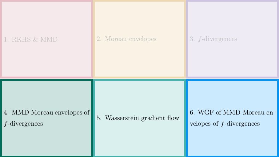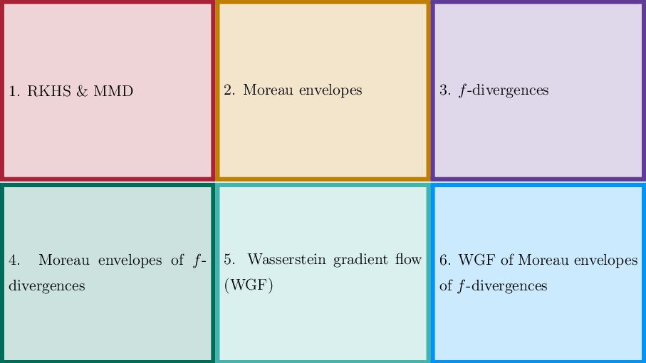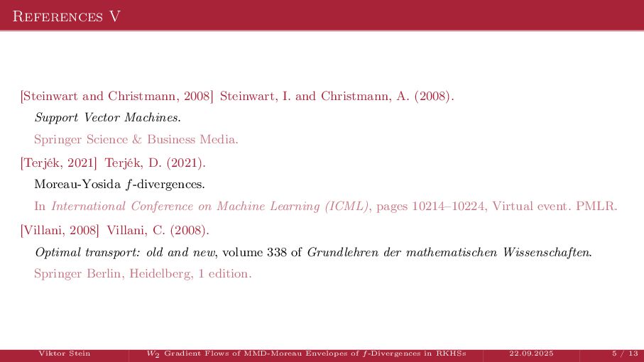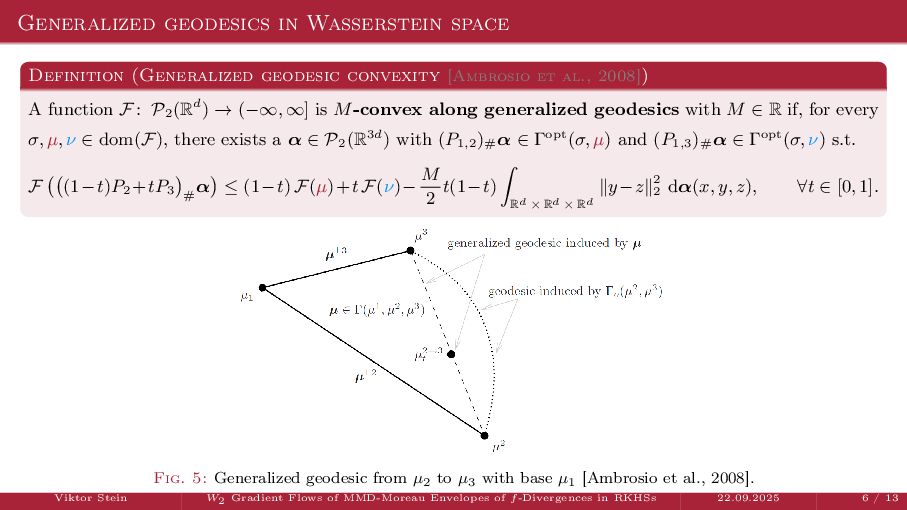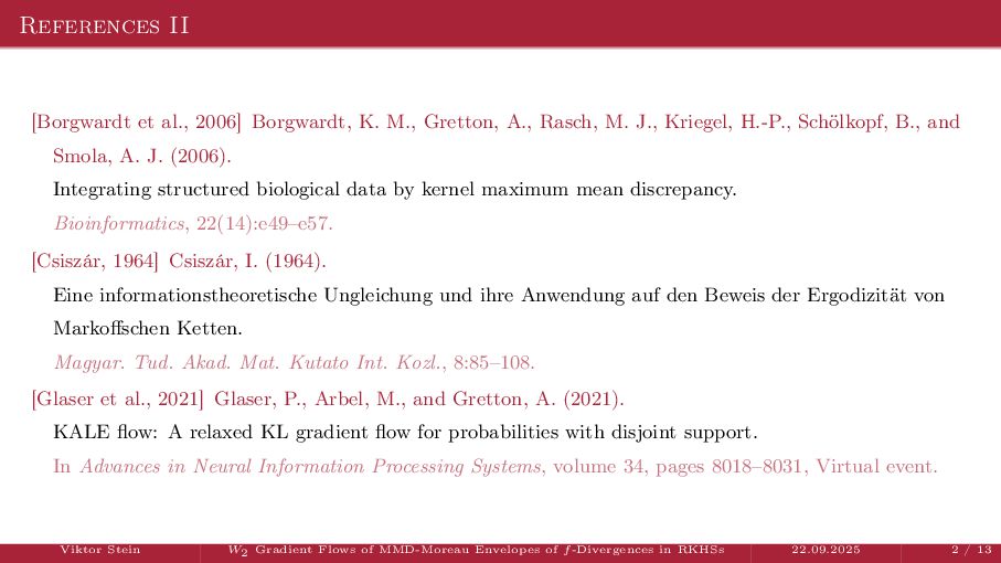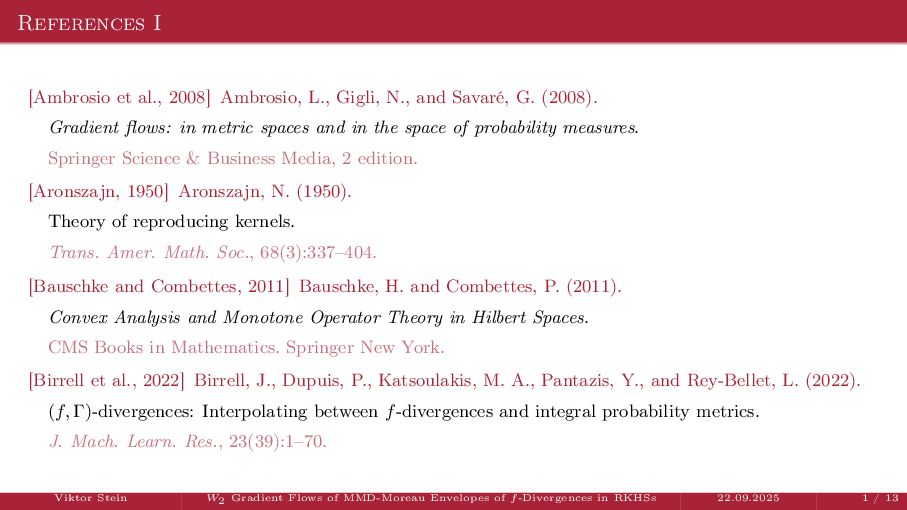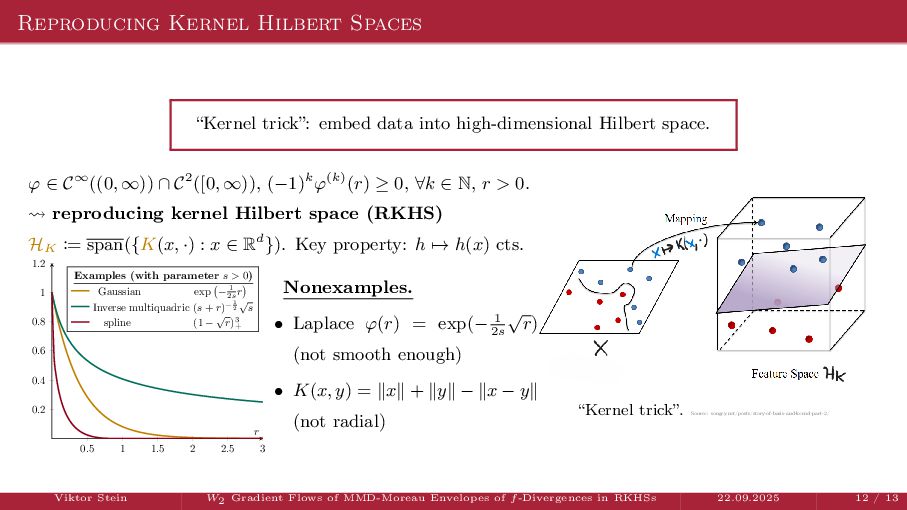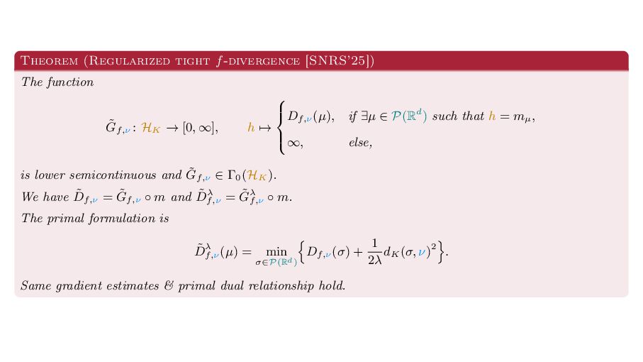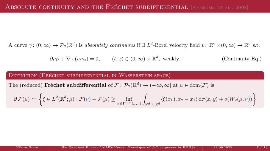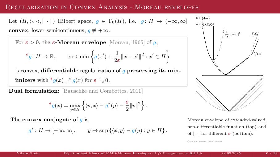 OT using Rényi Divergences Rényi divergence ̸∈ {f-div., Bregman div.}, α ∈ (0, 1) Rα (µ | ν) := 1 α − 1 ln X dµ dτ α dν dτ 1−α dτ , OTε,α (µ, ν) := min π∈Π(µ,ν) ⟨c, π⟩ + εRα (π | µ ⊗ ν) is a metric, where ε > 0, µ, ν ∈ P(X), X compact. OT(µ, ν) α↘0 ← − − − − or ε→0 OTε,α (µ, ν) α↗1 − − − → OTKL ε (µ, ν). In the works: debiased Rényi-Sinkhorn divergence OTε,α (µ, ν) − 1 2 OTε,α (µ, µ) − 1 2 OTε,α (ν, ν). W2 gradient flows of dK (·, ν)2 with K(x, y) := −|x − y| in 1D. Reformulation as maximal monotone inclu- sion Cauchy problem in L2 (0, 1) via quantile functions. Comprehensive description of solutions’ behav- ior, instantaneous measure-to-L∞ regular- ization, implicit Euler is simple. Viktor Stein W2 Gradient Flows of MMD-Moreau Envelopes of f-Divergences in RKHSs 22.09.2025 13 / 13 −1 −0.5 0.5 1 1.5 2 1 2 3 µ0 8 6 4 2 0 2 4 6 8 0.00 0.05 0.10 0.15 0.20 0.25 0.30 0.35 0.40 Iteration 0 initial target explicit implicit
