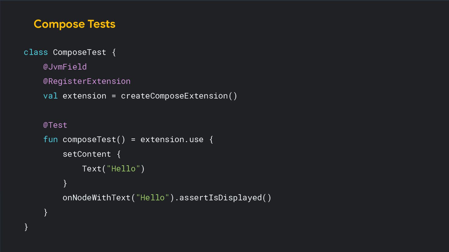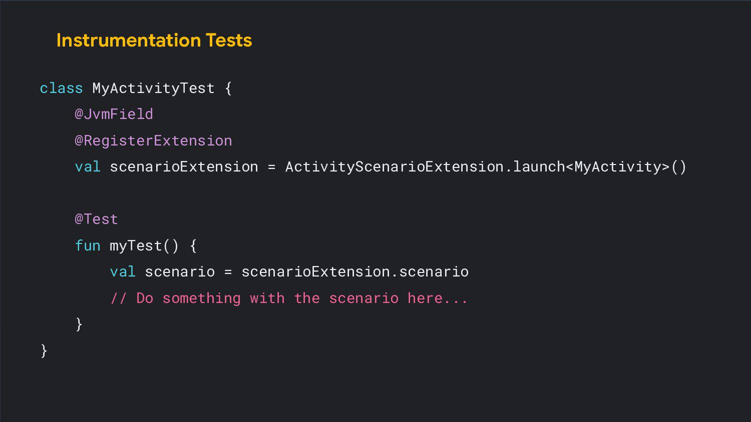 ActivityScenarioExtension.launch<MyActivity>() @Test fun myTest() { val scenario = scenarioExtension.scenario // Do something with the scenario here... } }