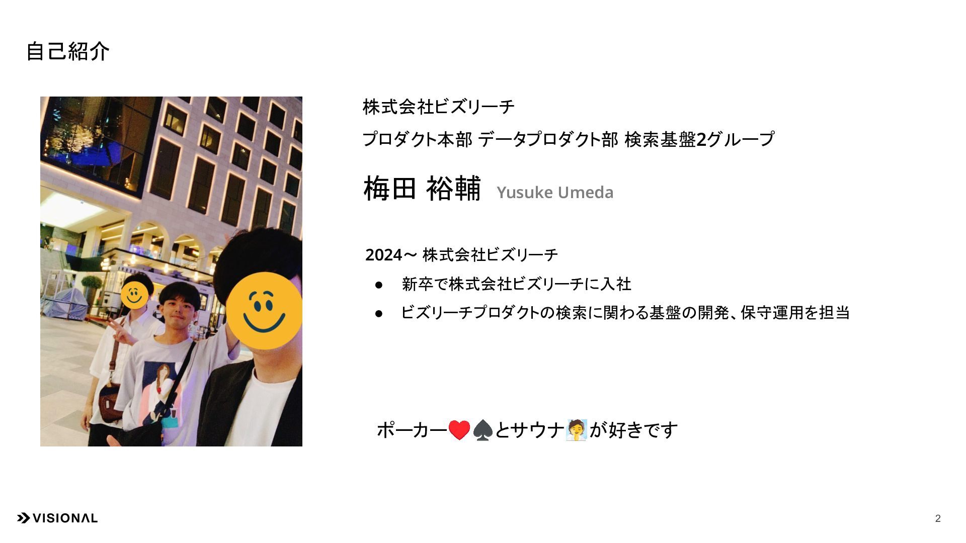 2024〜 株式会社ビズリーチ • 新卒で株式会社ビズリーチに入社 • ビズリーチプロダクトの検索に関わる基盤の開発、保守運用を担当 ポーカー♥♠とサウナ🧖が好きです