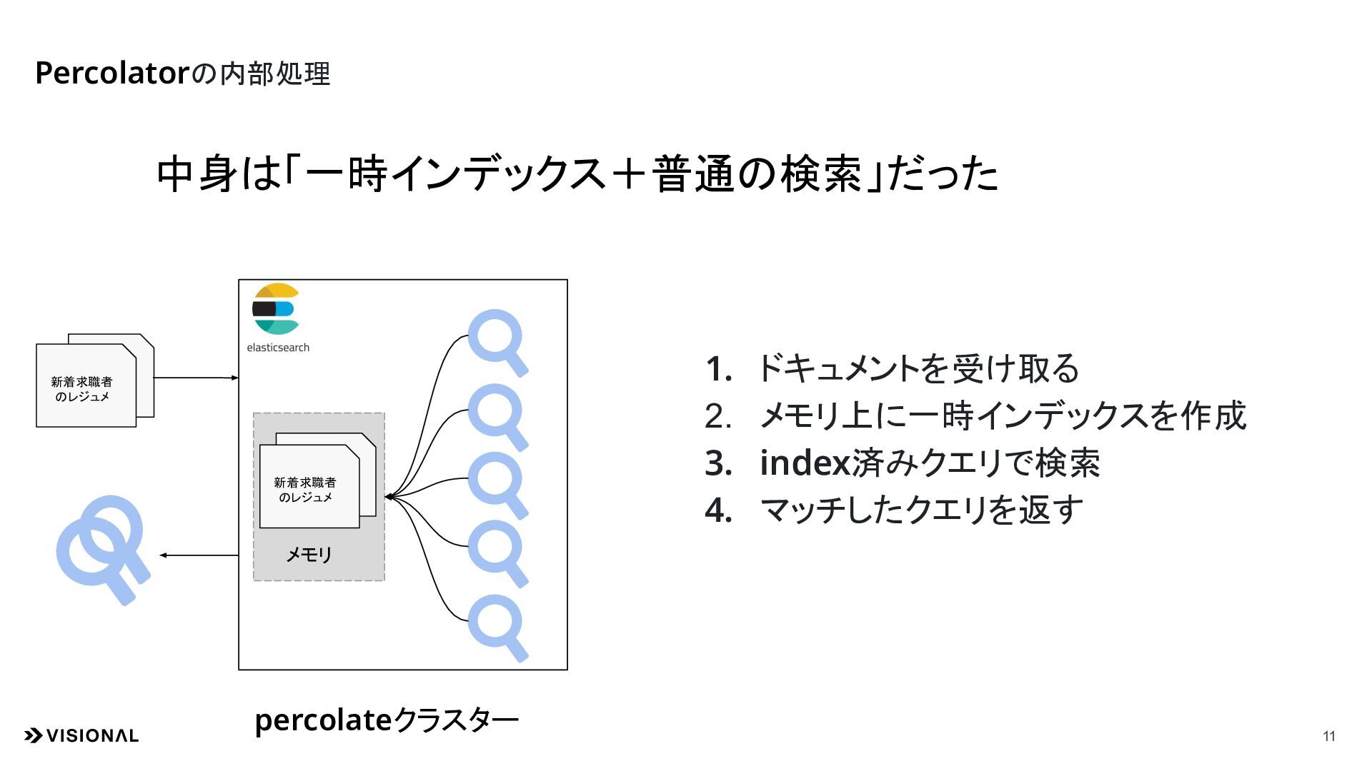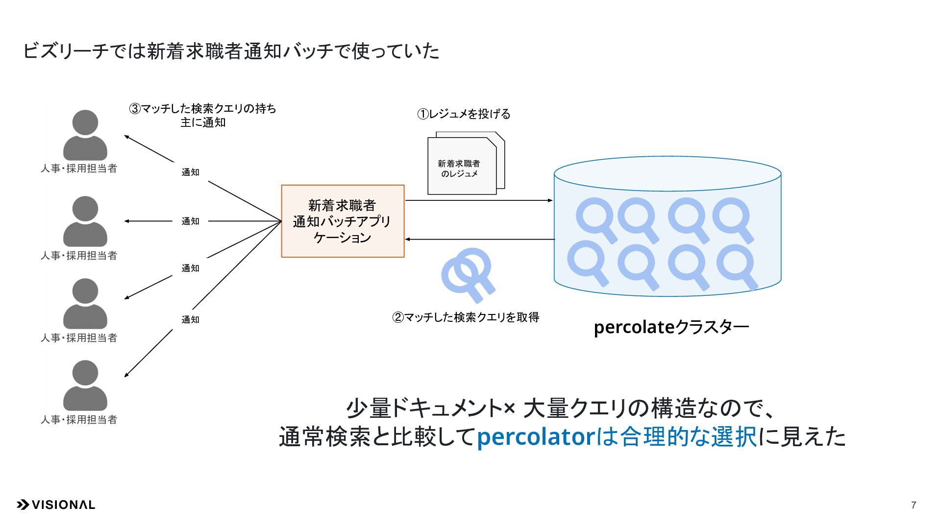 ②マッチした検索クエリを取得 通知 通知 通知 通知 percolateクラスター ①レジュメを投げる 人事・採用担当者 ③マッチした検索クエリの持ち 主に通知 新着求職者 のレジュメ 人事・採用担当者 人事・採用担当者 人事・採用担当者