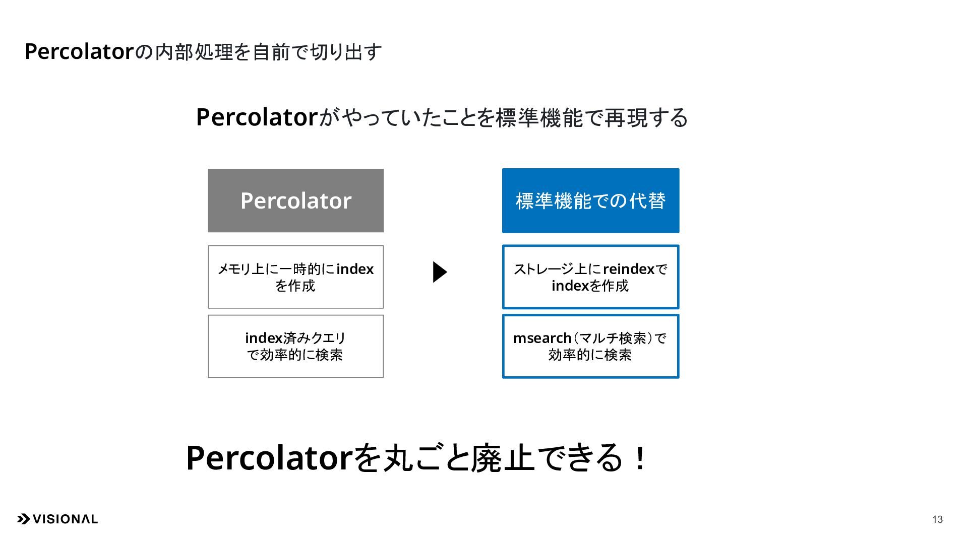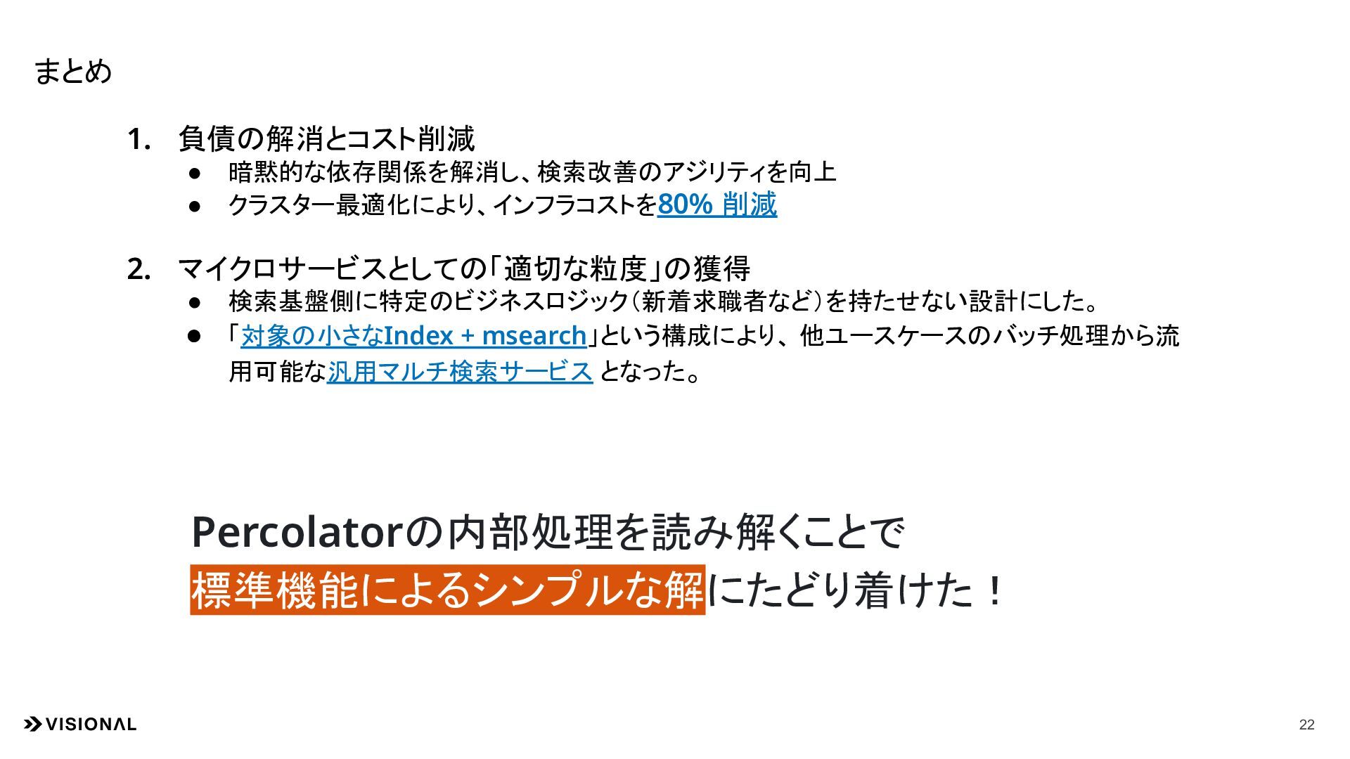 12. まとめ 22 Percolatorの内部処理を読み解くことで 標準機能によるシンプルな解にたどり着けた! 1. 負債の解消とコスト削減 • 暗黙的な依存関係を解消し、検索改善のアジリティを向上 • クラスター最適化により、インフラコストを80%