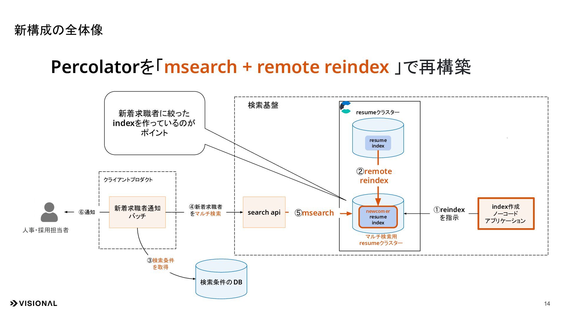 アプリケーション 検索条件のDB 検索基盤 クライアントプロダクト ①reindex を指示 resumeクラスター マルチ検索用 resumeクラスター ③検索条件 を取得 人事・採用担当者 newcomer resume index ⑤msearch ②remote reindex ④新着求職者 をマルチ検索 Percolatorを「msearch + remote reindex 」で再構築 ⑥通知 新着求職者に絞った indexを作っているのが ポイント