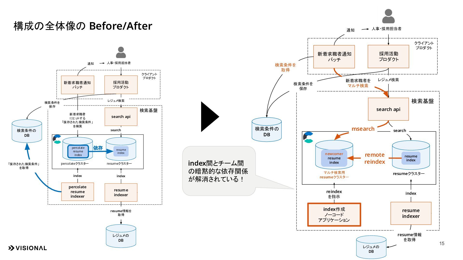 resume indexer 検索条件の DB 検索基盤 クライアント プロダクト resume index resumeクラスター percolateクラスター 人事・採用担当者 構成の全体像の Before/After search レジュメ検索 index 新着求職者 にヒットする 「保存された検索条件」 を検索 index 検索条件を 保存 通知 採用活動 プロダクト 新着求職者通知 バッチ search api resume indexer index作成 ノーコード アプリケーション 検索条件の DB 検索基盤 クライアント プロダクト resume index newcomer resume index resumeクラスター マルチ検索用 resumeクラスター 人事・採用担当者 search レジュメ検索 index 検索条件を 保存 通知 msearch remote reindex 新着求職者を マルチ検索 検索条件を 取得 reindex を指示 index間とチーム間 の暗黙的な依存関係 が解消されている! レジュメの DB resume情報を 取得 レジュメの DB resume情報 を取得 percolate resume index 依存 「保存された検索条件」 を取得