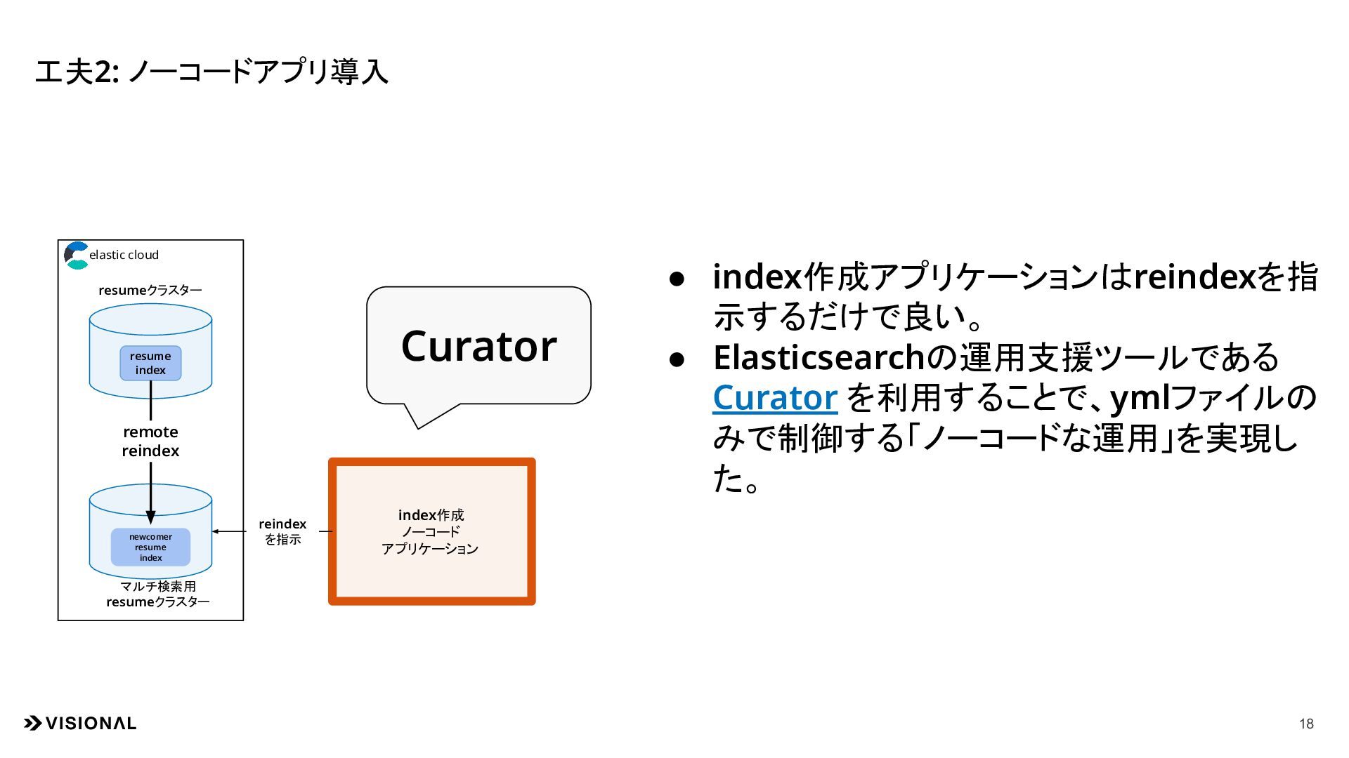 resumeクラスター マルチ検索用 resumeクラスター remote reindex newcomer resume index • index作成アプリケーションはreindexを指 示するだけで良い。 • Elasticsearchの運用支援ツールである Curator を利用することで、ymlファイルの みで制御する「ノーコードな運用」を実現し た。 Curator elastic cloud