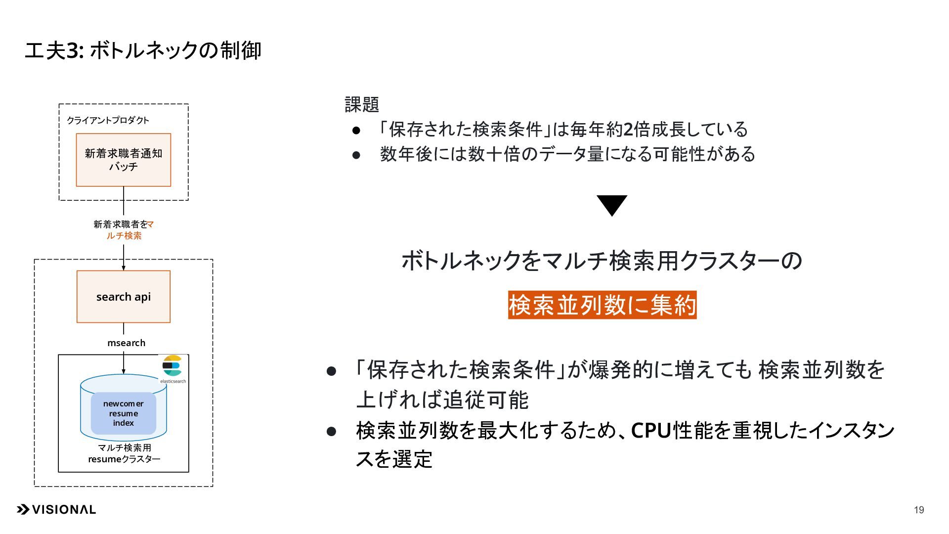 マルチ検索用 resumeクラスター newcomer resume index msearch 新着求職者を マ ルチ検索 課題 • 「保存された検索条件」は毎年約2倍成長している • 数年後には数十倍のデータ量になる可能性がある • 「保存された検索条件」が爆発的に増えても 検索並列数を 上げれば追従可能 • 検索並列数を最大化するため、CPU性能を重視したインスタン スを選定