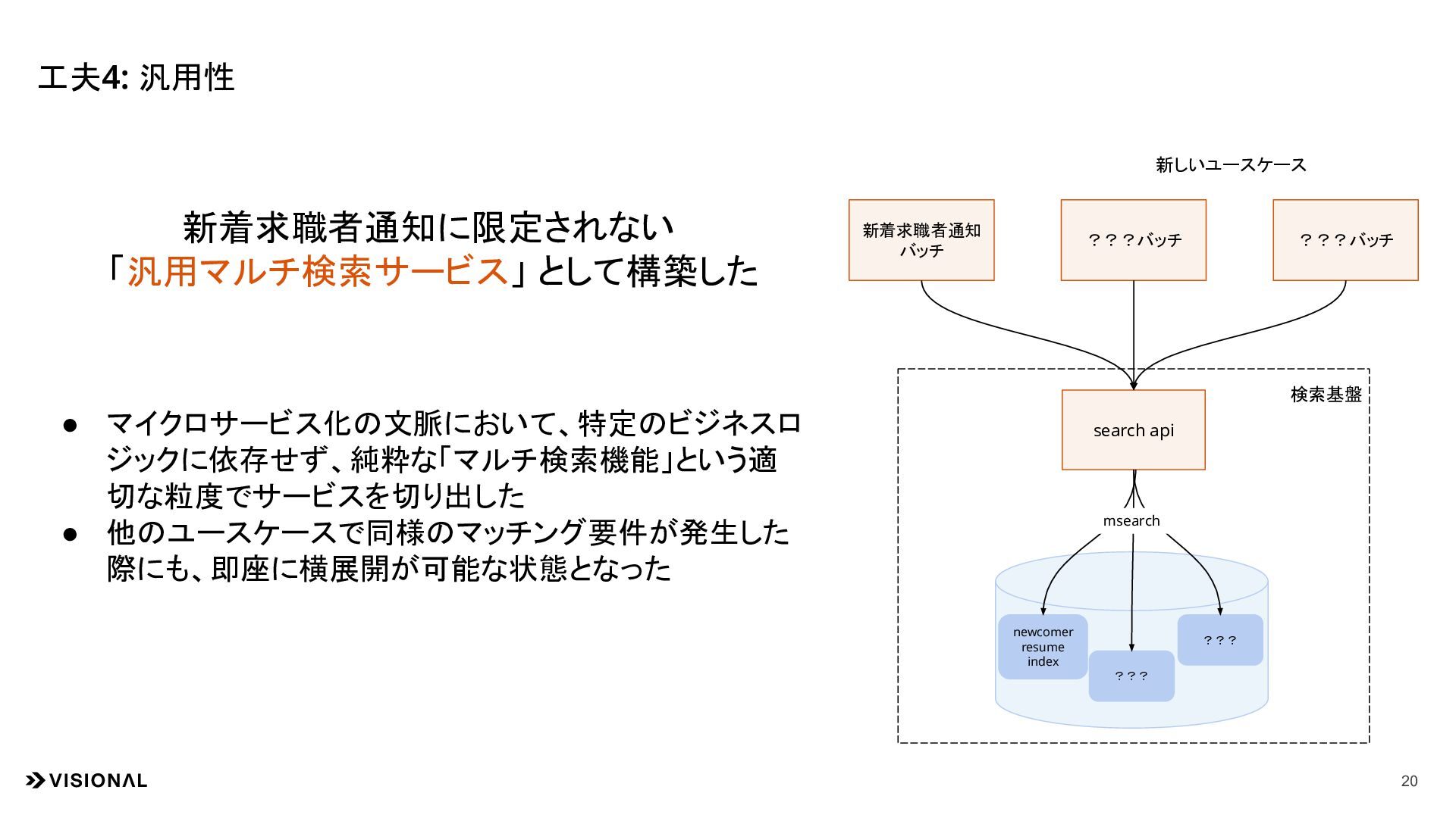 削減 2. マイクロサービスとしての「適切な粒度」の獲得 • 検索基盤側に特定のビジネスロジック(新着求職者など)を持たせない設計にした。 • 「対象の小さなIndex + msearch」という構成により、 他ユースケースのバッチ処理から流 用可能な汎用マルチ検索サービス となった。