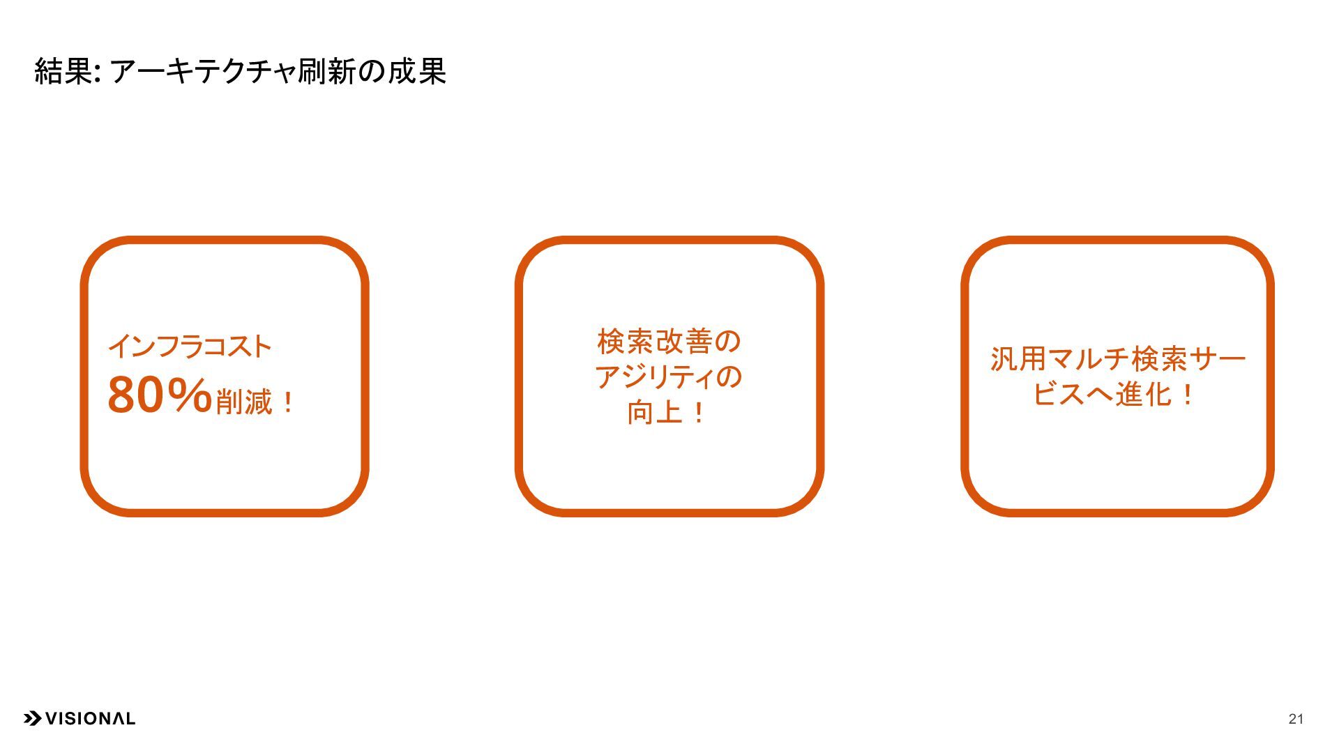 11. 工夫4: 汎用性 20 • マイクロサービス化の文脈において、特定のビジネスロ ジックに依存せず、純粋な「マルチ検索機能」という適 切な粒度でサービスを切り出した • 他のユースケースで同様のマッチング要件が発生した 際にも、即座に横展開が可能な状態となった