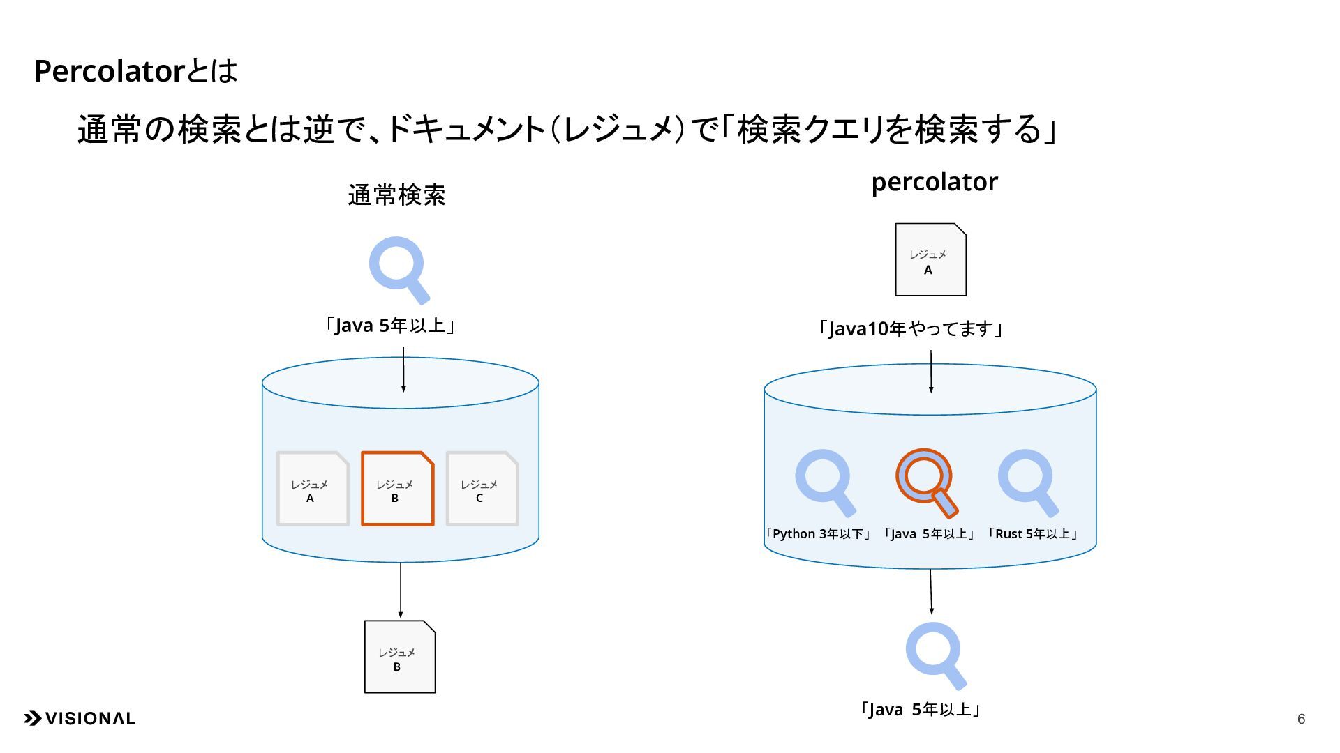 「Java 5年以上」 「Python 3年以下」 「Rust 5年以上」 「Java 5年以上」 通常検索 percolator レジュメ A レジュメ C レジュメ B