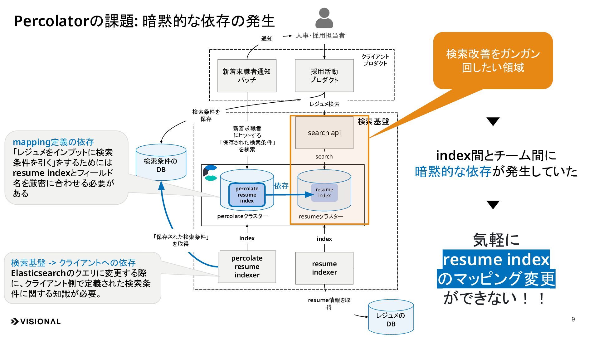 resume indexer 検索条件の DB 検索基盤 クライアント プロダクト resume index percolate resume index resumeクラスター percolateクラスター 人事・採用担当者 mapping定義の依存 「レジュメをインプットに検索 条件を引く」をするためには resume indexとフィールド 名を厳密に合わせる必要が ある 検索基盤 -> クライアントへの依存 Elasticsearchのクエリに変更する際 に、クライアント側で定義された検索条 件に関する知識が必要。 Percolatorの課題: 暗黙的な依存の発生 検索改善をガンガン 回したい領域 search index 新着求職者 にヒットする 「保存された検索条件」 を検索 index 検索条件を 保存 通知 index間とチーム間に 暗黙的な依存が発生していた 気軽に resume index のマッピング変更 ができない!! 依存 レジュメの DB resume情報を取 得 「保存された検索条件」 を取得 レジュメ検索