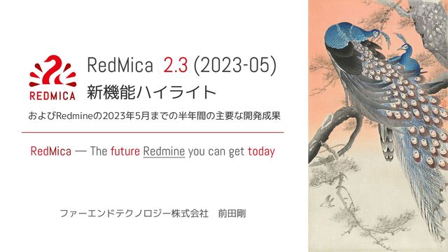 RedMicaはRedmineの先行リリース版です。半年に1回という短い間隔でリリースされることでRedmine次期バージョンの新機能を先行して利用できることが特徴です。このたびリリースされたRedMica 2.3では、Redmineプロジェクトにおける2022年12月から2023年5月までの6ヶ月間の開発成果が含まれています。つまり、この発表で紹介するRedMica 2.3の新機能は半年間のRedmineの開発成果の紹介でもあります。