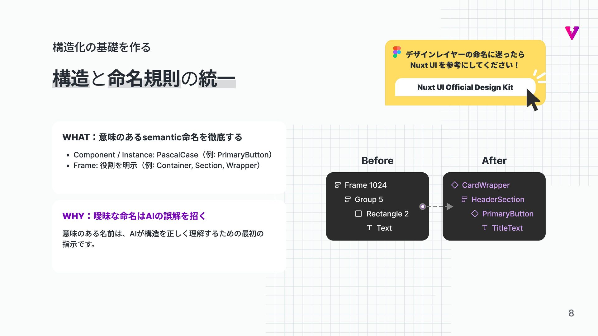 Instance: PascalCase(例: PrimaryButton) Frame: 役割を明示(例: Container, Section, Wrapper WHYˆÖ'j } o A In¤ã ™ ÛO  s n B ‰ M o  A I L Ë ™ c W O  ã Y ‰ _ † n ˛ n  : g Y  Be for e Fr am e 10 24 Gro up 5 Rectangle 2 Tex t Aft er Card Wrappe r He ad er Se cti o n Pr im ary Bu tt on Ti tl eT ex t Ë h} ‘Gn q Ë n ú™ \ ‰ Ç ¶ ¤ ó ì ¤ ä ü n } k ÷ c _ › N u x t U I ™   k W f O ` U D  Nuxt UI Official Design Ki