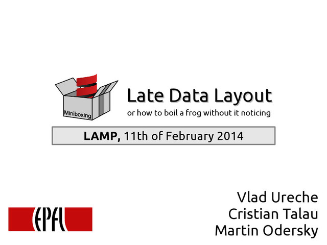 Data Layout is Late Data Layout • choice made by injecting annotations • easy to rewrite the tree • coercions inserted late and on-demand def bar: Unit = { this.foo(...) ... } this.foo_J(...) No coercion necessary @storage T <: WildcardType