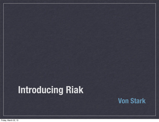 systems like Riak because it provides inter-node communication, message queues, failure detectors, and client-server abstractions out of the box. What's more, most frequently-used patterns in Erlang have been implemented in library modules, commonly referred to as OTP behaviors. They contain the generic code framework for concurrency and error handling, simplifying concurrent programming and protecting the developer from many common pitfalls. Behaviors are monitored by supervisors, themselves a behavior, and grouped together in supervision trees. A supervision tree is packaged in an application, creating a building block of an Erlang program. A complete Erlang system such as Riak is a set of loosely coupled applications that interact with each other. Some of these applications have been written by the developer, some are part of the standard Erlang/OTP distribution, and some may be other open source components. They are sequentially loaded and started by a boot script generated from a list of applications and versions. HTTP://WWW.AOSABOOK.ORG/EN/RIAK.HTML Friday, March 22, 13