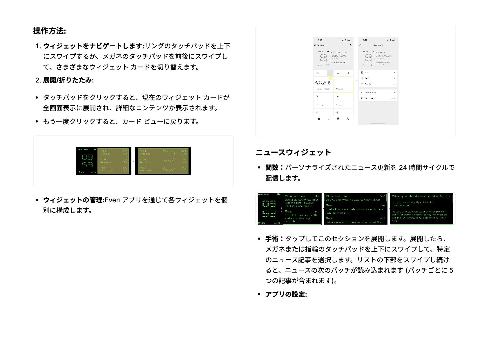 全画面表示に展開され、詳細なコンテンツが表示されます。 もう一度クリックすると、カード ビューに戻ります。 ウィジェットの管理:Even アプリを通じて各ウィジェットを個 別に構成します。 ニュースウィジェット 関数:パーソナライズされたニュース更新を 24 時間サイクルで 配信します。 手術:タップしてこのセクションを展開します。展開したら、 メガネまたは指輪のタッチパッドを上下にスワイプして、特定 のニュース記事を選択します。リストの下部をスワイプし続け ると、ニュースの次のバッチが読み込まれます (バッチごとに 5 つの記事が含まれます)。 アプリの設定: