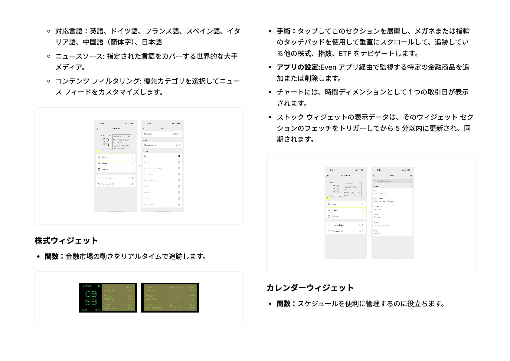 フィードをカスタマイズします。 株式ウィジェット 関数:金融市場の動きをリアルタイムで追跡します。 手術:タップしてこのセクションを展開し、メガネまたは指輪 のタッチパッドを使用して垂直にスクロールして、追跡してい る他の株式、指数、ETF をナビゲートします。 アプリの設定:Even アプリ経由で監視する特定の金融商品を追 加または削除します。 チャートには、時間ディメンションとして 1 つの取引日が表示 されます。 ストック ウィジェットの表示データは、そのウィジェット セク ションのフェッチをトリガーしてから 5 分以内に更新され、同 期されます。 カレンダーウィジェット 関数:スケジュールを便利に管理するのに役立ちます。