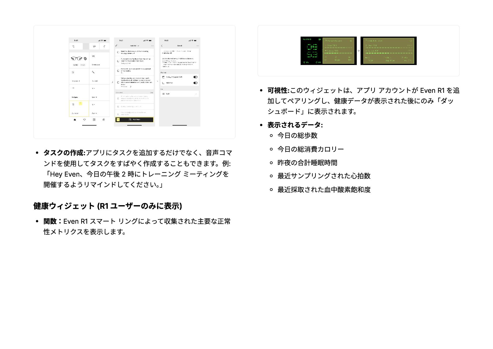 (R1 ユーザーのみに表示) 関数:Even R1 スマート リングによって収集された主要な正常 性メトリクスを表示します。 可視性:このウィジェットは、アプリ アカウントが Even R1 を追 加してペアリングし、健康データが表示された後にのみ「ダッ シュボード」に表示されます。 表示されるデータ: 今日の総歩数 今日の総消費カロリー 昨夜の合計睡眠時間 最近サンプリングされた心拍数 最近採取された血中酸素飽和度