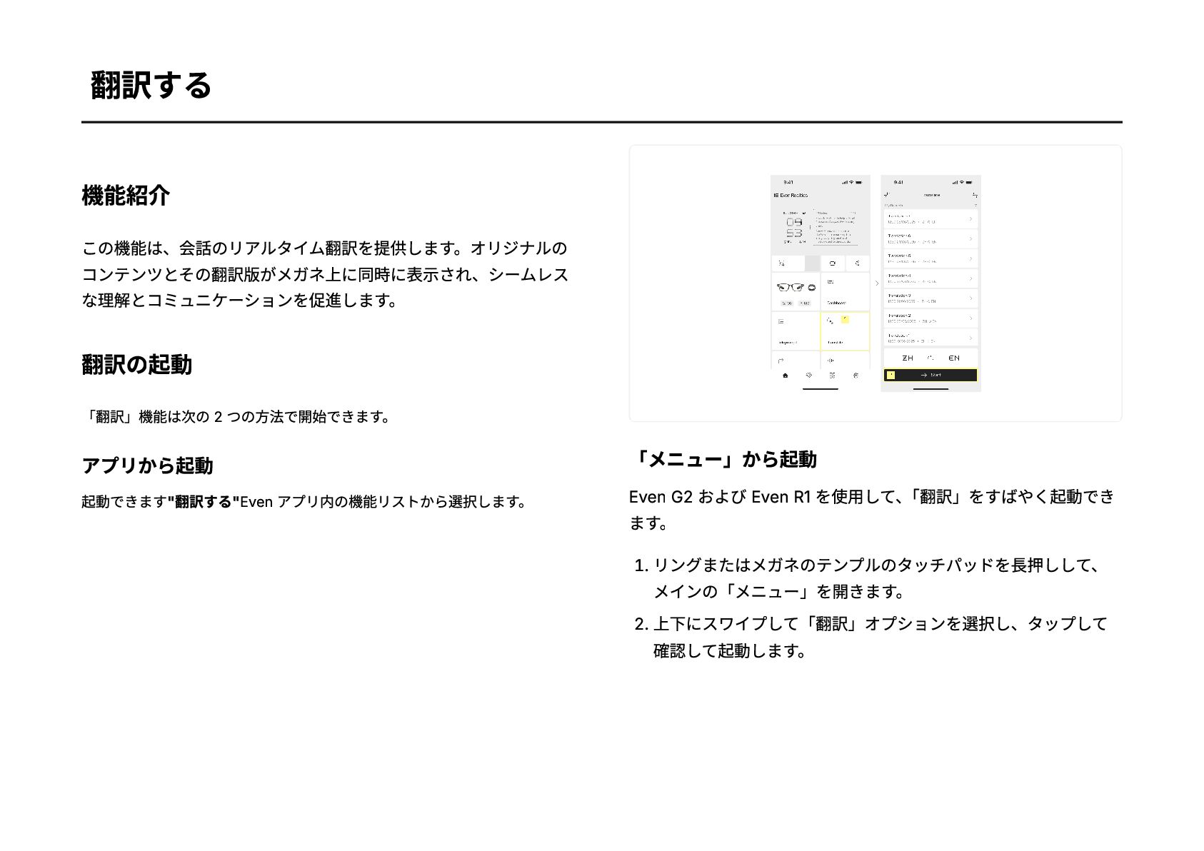 アプリから起動 起動できます"翻訳する"Even アプリ内の機能リストから選択します。 「メニュー」から起動 Even G2 および Even R1 を使用して、 「翻訳」をすばやく起動でき ます。 1. リングまたはメガネのテンプルのタッチパッドを長押しして、 メインの「メニュー」を開きます。 2. 上下にスワイプして「翻訳」オプションを選択し、タップして 確認して起動します。