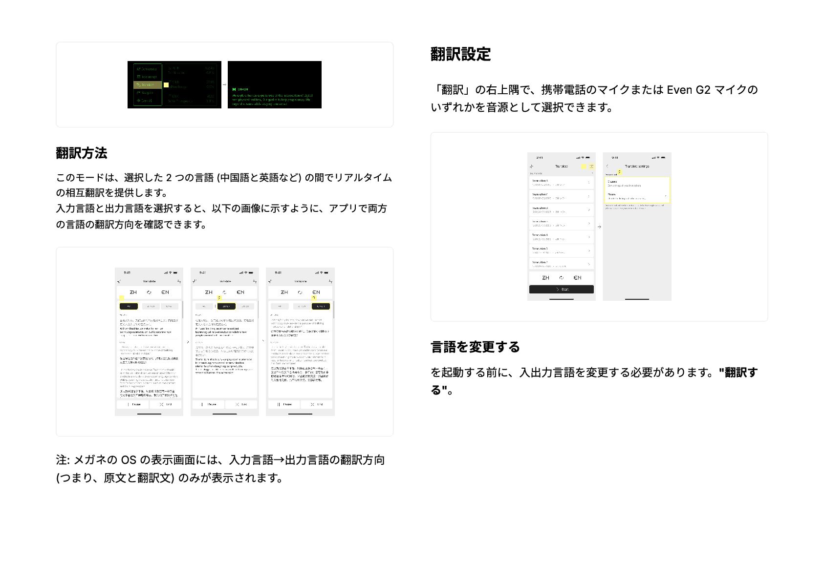 メガネの OS の表示画面には、入力言語→出力言語の翻訳方向 (つまり、原文と翻訳文) のみが表示されます。 翻訳設定 「翻訳」の右上隅で、携帯電話のマイクまたは Even G2 マイクの いずれかを音源として選択できます。 言語を変更する を起動する前に、入出力言語を変更する必要があります。"翻訳す る"。