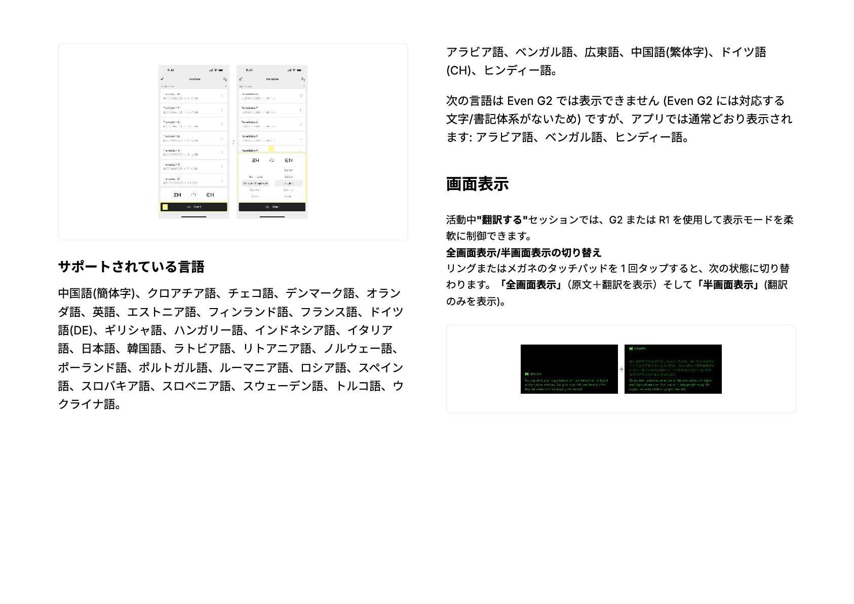 次の言語は Even G2 では表示できません (Even G2 には対応する 文字/書記体系がないため) ですが、アプリでは通常どおり表示され ます: アラビア語、ベンガル語、ヒンディー語。 画面表示 活動中"翻訳する"セッションでは、G2 または R1 を使用して表示モードを柔 軟に制御できます。 全画面表示/半画面表示の切り替え リングまたはメガネのタッチパッドを 1 回タップすると、次の状態に切り替 わります。「全画面表示」 (原文+翻訳を表示)そして「半画面表示」(翻訳 のみを表示)。