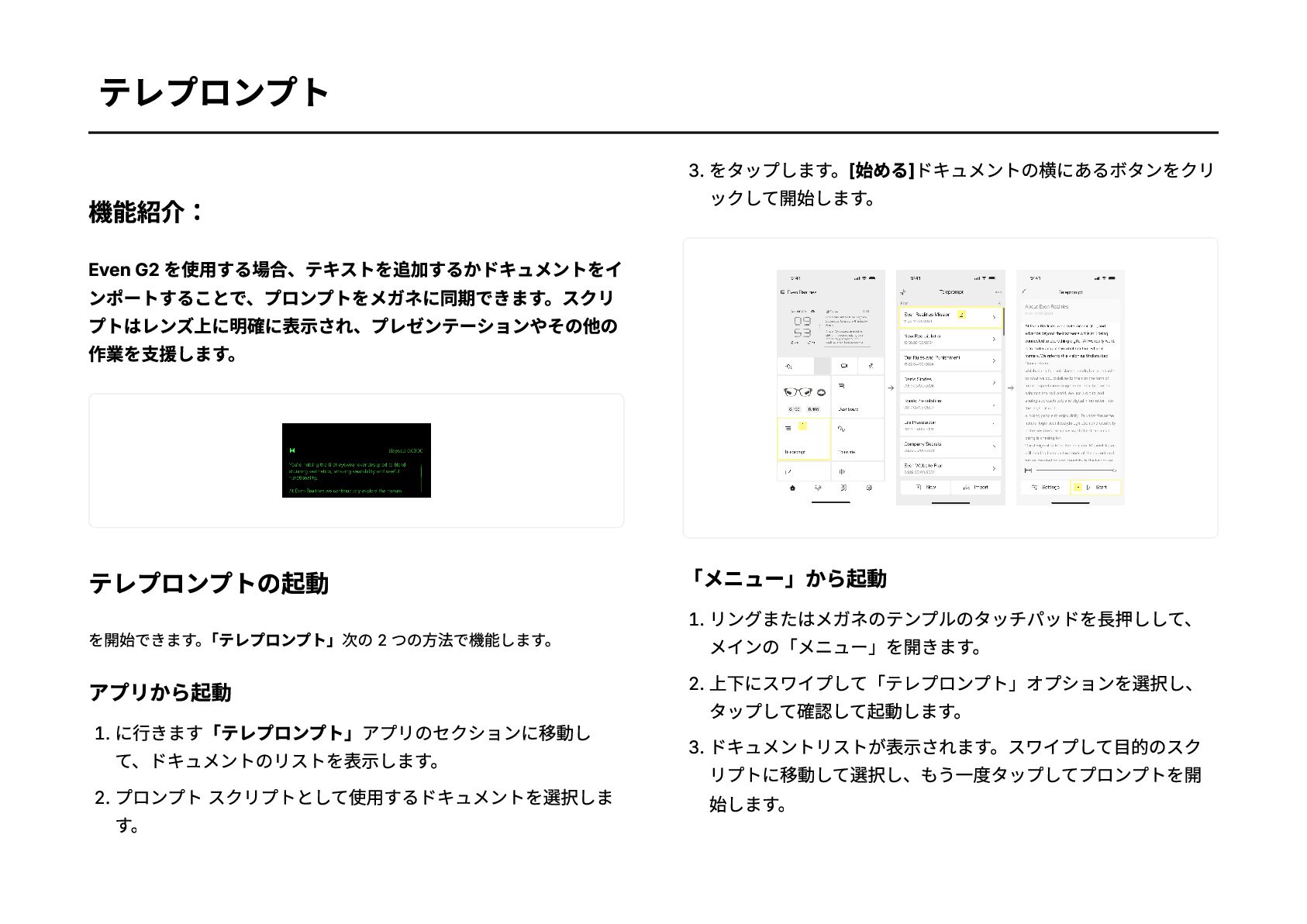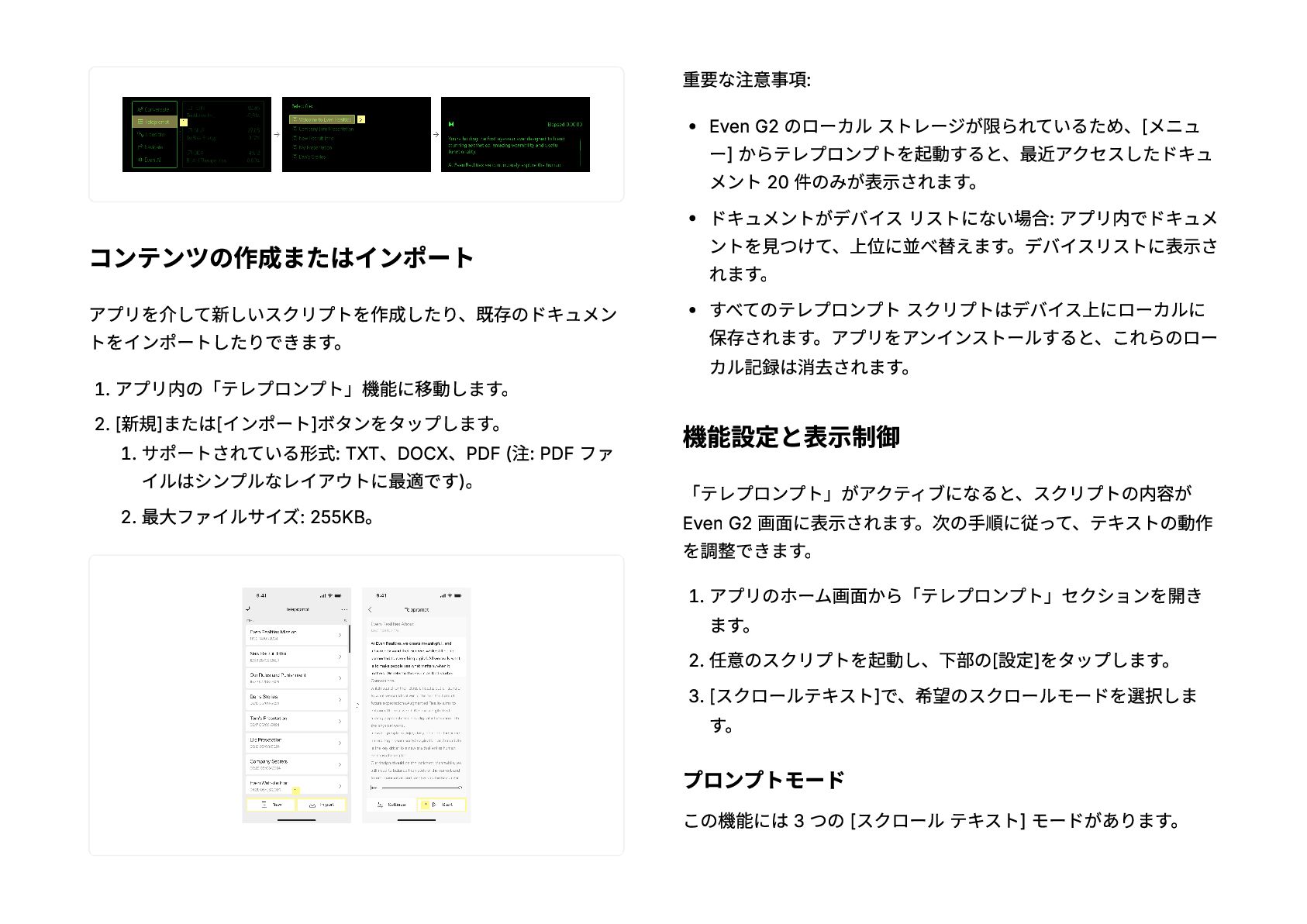 (注: PDF ファ イルはシンプルなレイアウトに最適です)。 2. 最大ファイルサイズ: 255KB。 重要な注意事項: Even G2 のローカル ストレージが限られているため、[メニュ ー] からテレプロンプトを起動すると、最近アクセスしたドキュ メント 20 件のみが表示されます。 ドキュメントがデバイス リストにない場合: アプリ内でドキュメ ントを見つけて、上位に並べ替えます。デバイスリストに表示さ れます。 すべてのテレプロンプト スクリプトはデバイス上にローカルに 保存されます。アプリをアンインストールすると、これらのロー カル記録は消去されます。 機能設定と表示制御 「テレプロンプト」がアクティブになると、スクリプトの内容が Even G2 画面に表示されます。次の手順に従って、テキストの動作 を調整できます。 1. アプリのホーム画面から「テレプロンプト」セクションを開き ます。 2. 任意のスクリプトを起動し、下部の[設定]をタップします。 3. [スクロールテキスト]で、希望のスクロールモードを選択しま す。 プロンプトモード この機能には 3 つの [スクロール テキスト] モードがあります。
