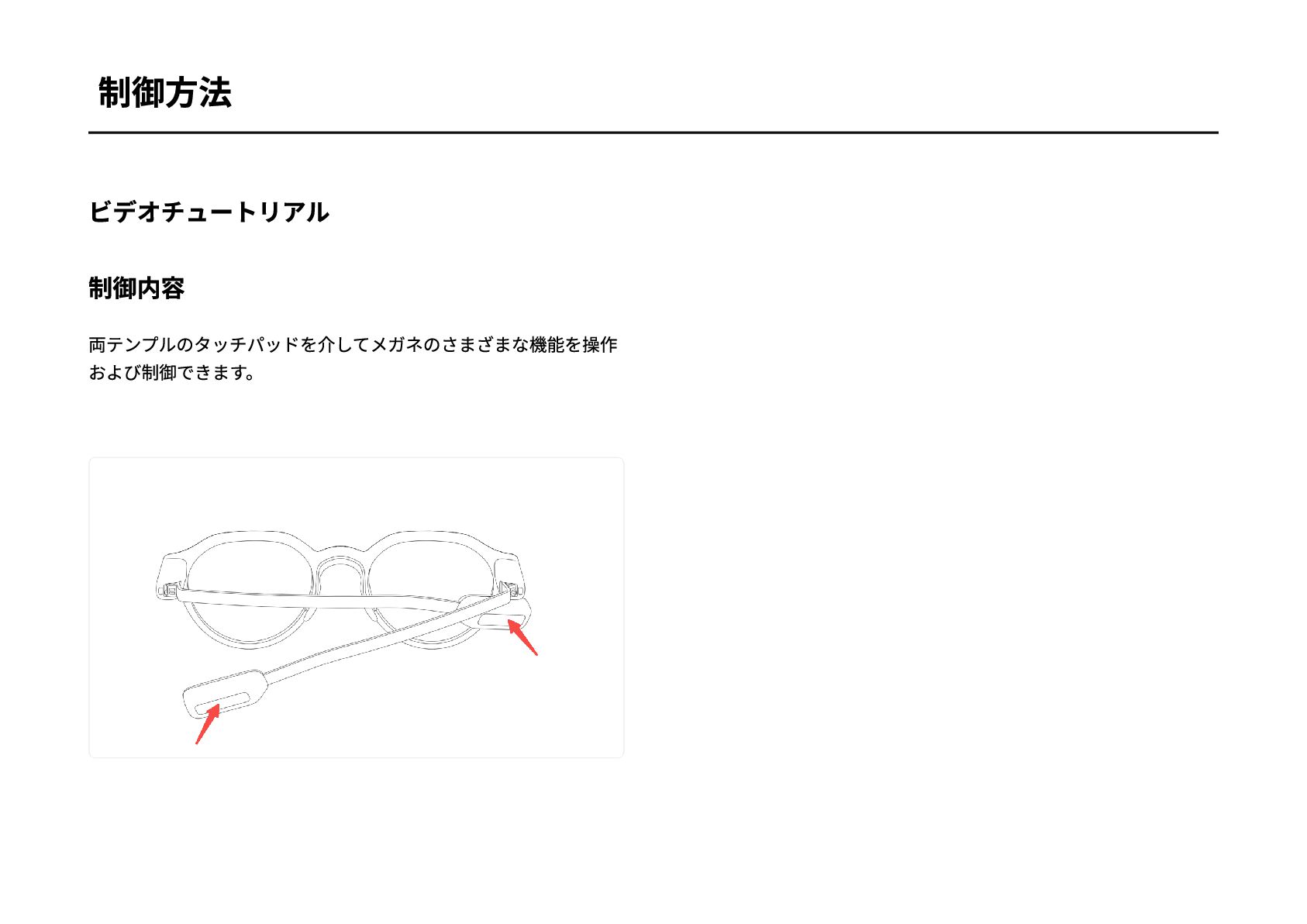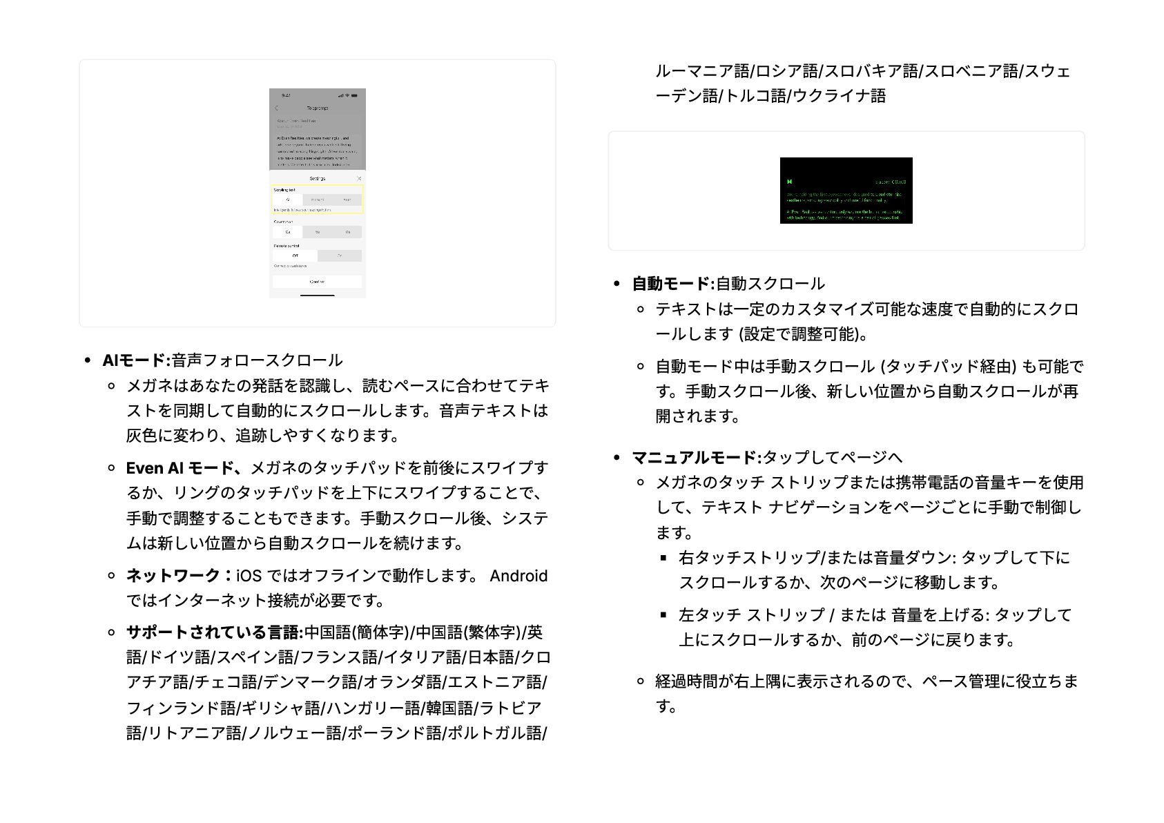 手動で調整することもできます。手動スクロール後、システ ムは新しい位置から自動スクロールを続けます。 ネットワーク:iOS ではオフラインで動作します。 Android ではインターネット接続が必要です。 サポートされている言語:中国語(簡体字)/中国語(繁体字)/英 語/ドイツ語/スペイン語/フランス語/イタリア語/日本語/クロ アチア語/チェコ語/デンマーク語/オランダ語/エストニア語/ フィンランド語/ギリシャ語/ハンガリー語/韓国語/ラトビア 語/リトアニア語/ノルウェー語/ポーランド語/ポルトガル語/ ルーマニア語/ロシア語/スロバキア語/スロベニア語/スウェ ーデン語/トルコ語/ウクライナ語 自動モード:自動スクロール テキストは一定のカスタマイズ可能な速度で自動的にスクロ ールします (設定で調整可能)。 自動モード中は手動スクロール (タッチパッド経由) も可能で す。手動スクロール後、新しい位置から自動スクロールが再 開されます。 マニュアルモード:タップしてページへ メガネのタッチ ストリップまたは携帯電話の音量キーを使用 して、テキスト ナビゲーションをページごとに手動で制御し ます。 右タッチストリップ/または音量ダウン: タップして下に スクロールするか、次のページに移動します。 左タッチ ストリップ / または 音量を上げる: タップして 上にスクロールするか、前のページに戻ります。 経過時間が右上隅に表示されるので、ペース管理に役立ちま す。