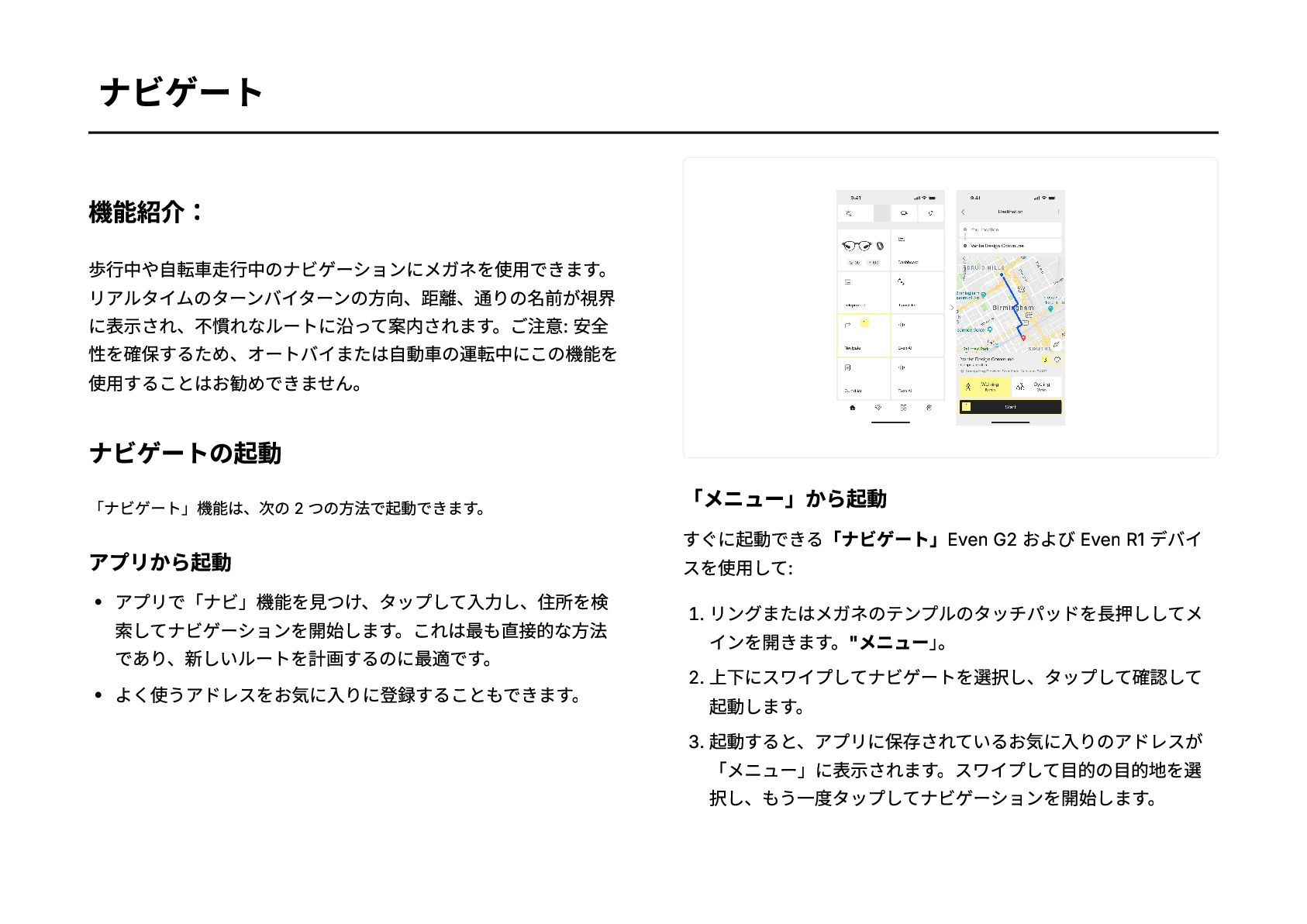 「ナビゲート」機能は、次の 2 つの方法で起動できます。 アプリから起動 アプリで「ナビ」機能を見つけ、タップして入力し、住所を検 索してナビゲーションを開始します。これは最も直接的な方法 であり、新しいルートを計画するのに最適です。 よく使うアドレスをお気に入りに登録することもできます。 「メニュー」から起動 すぐに起動できる「ナビゲート」Even G2 および Even R1 デバイ スを使用して: 1. リングまたはメガネのテンプルのタッチパッドを長押ししてメ インを開きます。"メニュー」 。 2. 上下にスワイプしてナビゲートを選択し、タップして確認して 起動します。 3. 起動すると、アプリに保存されているお気に入りのアドレスが 「メニュー」に表示されます。スワイプして目的の目的地を選 択し、もう一度タップしてナビゲーションを開始します。