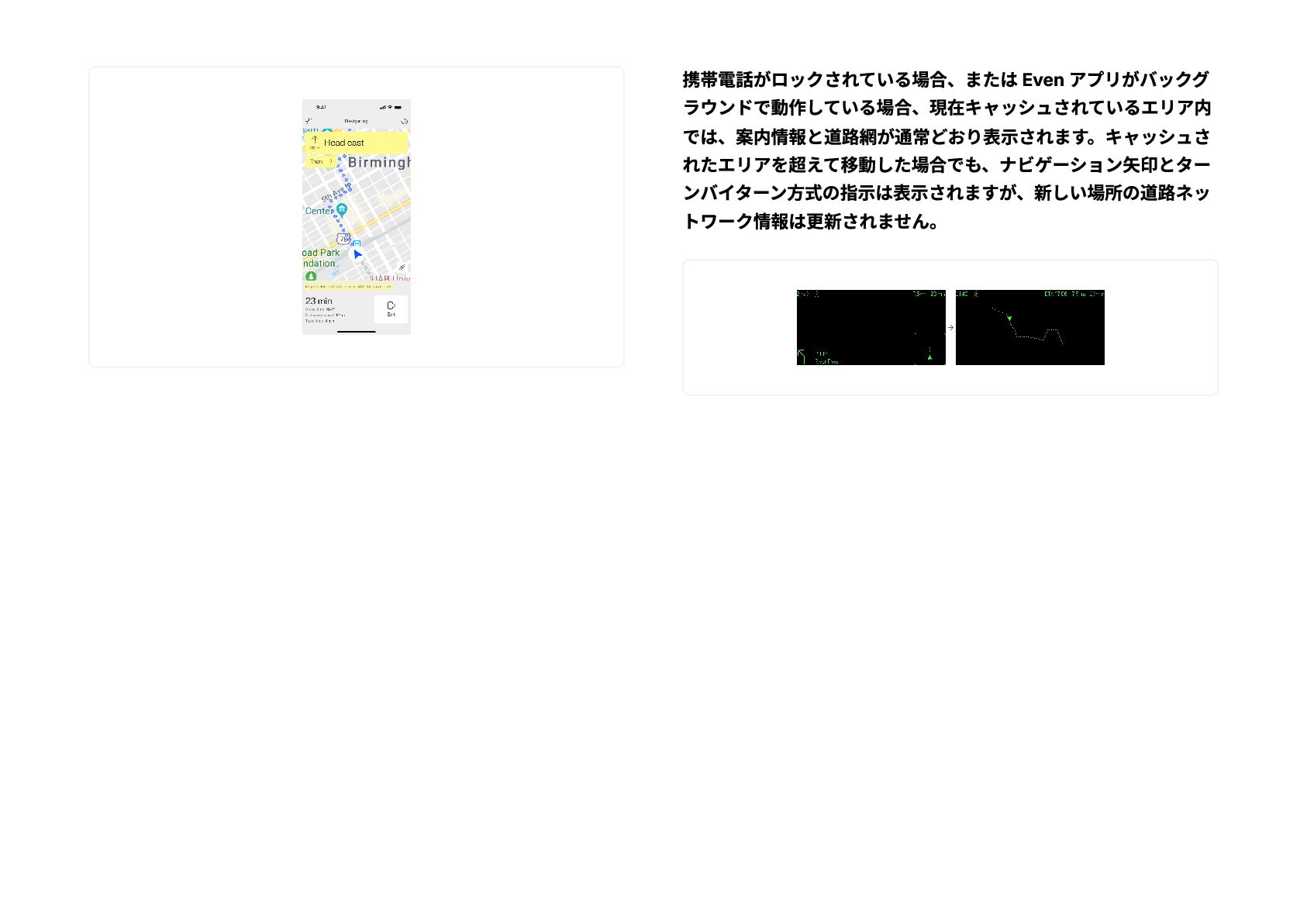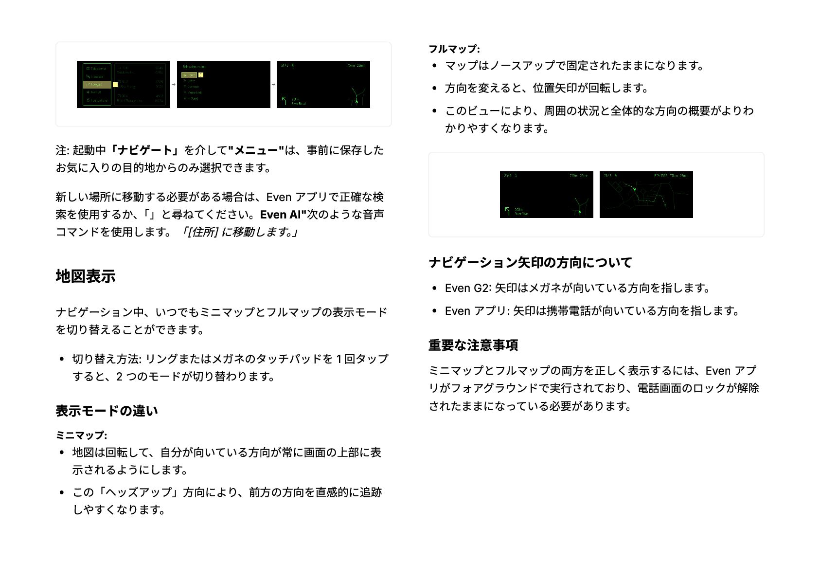 」 地図表示 ナビゲーション中、いつでもミニマップとフルマップの表示モード を切り替えることができます。 切り替え方法: リングまたはメガネのタッチパッドを 1 回タップ すると、2 つのモードが切り替わります。 表示モードの違い ミニマップ: 地図は回転して、自分が向いている方向が常に画面の上部に表 示されるようにします。 この「ヘッズアップ」方向により、前方の方向を直感的に追跡 しやすくなります。 フルマップ: マップはノースアップで固定されたままになります。 方向を変えると、位置矢印が回転します。 このビューにより、周囲の状況と全体的な方向の概要がよりわ かりやすくなります。 ナビゲーション矢印の方向について Even G2: 矢印はメガネが向いている方向を指します。 Even アプリ: 矢印は携帯電話が向いている方向を指します。 重要な注意事項 ミニマップとフルマップの両方を正しく表示するには、Even アプ リがフォアグラウンドで実行されており、電話画面のロックが解除 されたままになっている必要があります。