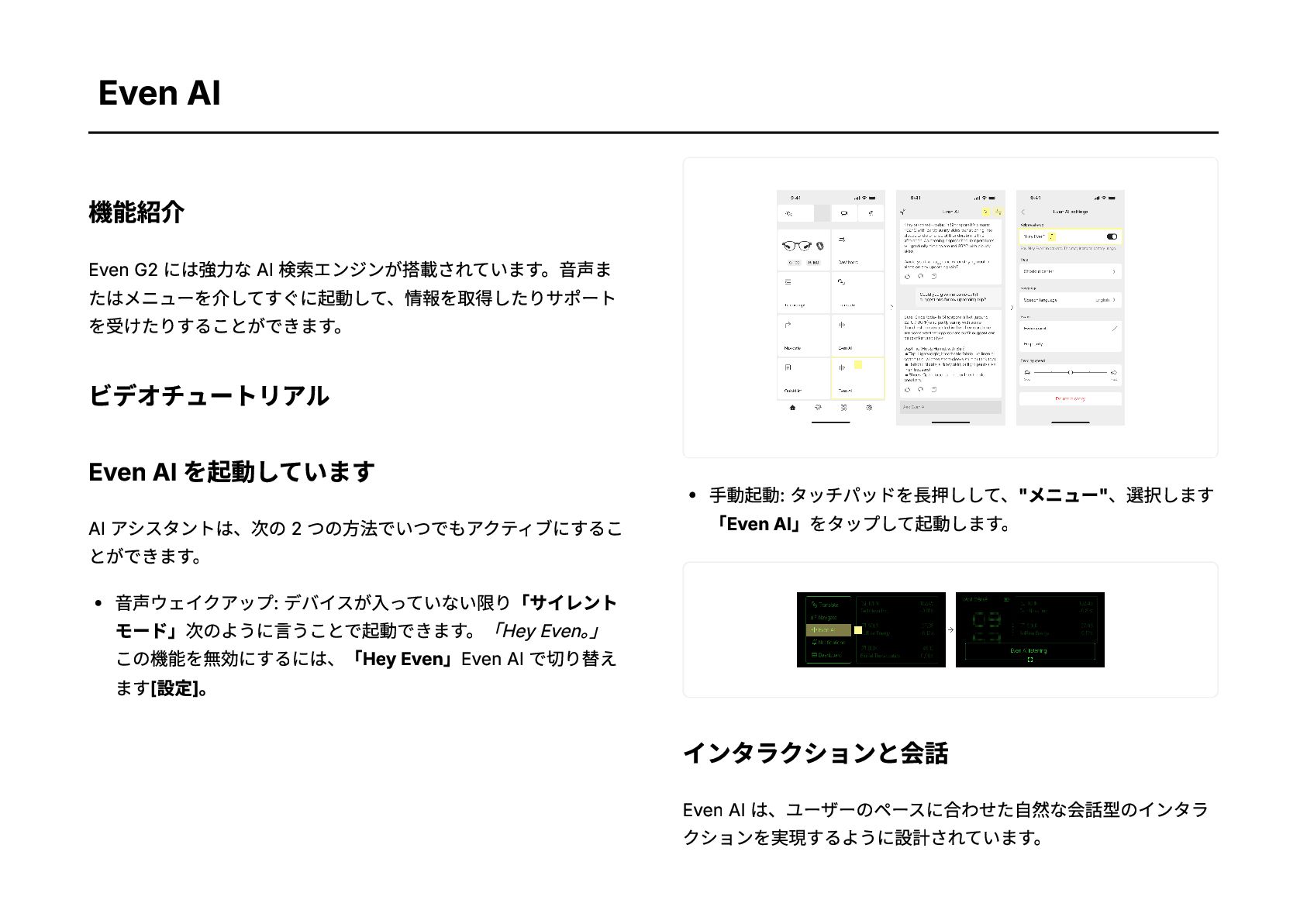 を受けたりすることができます。 ビデオチュートリアル Even AI を起動しています AI アシスタントは、次の 2 つの方法でいつでもアクティブにするこ とができます。 音声ウェイクアップ: デバイスが入っていない限り「サイレント モード」次のように言うことで起動できます。「Hey Even。 」 この機能を無効にするには、「Hey Even」Even AI で切り替え ます[設定]。 手動起動: タッチパッドを長押しして、"メニュー"、選択します 「Even AI」をタップして起動します。 インタラクションと会話 Even AI は、ユーザーのペースに合わせた自然な会話型のインタラ クションを実現するように設計されています。