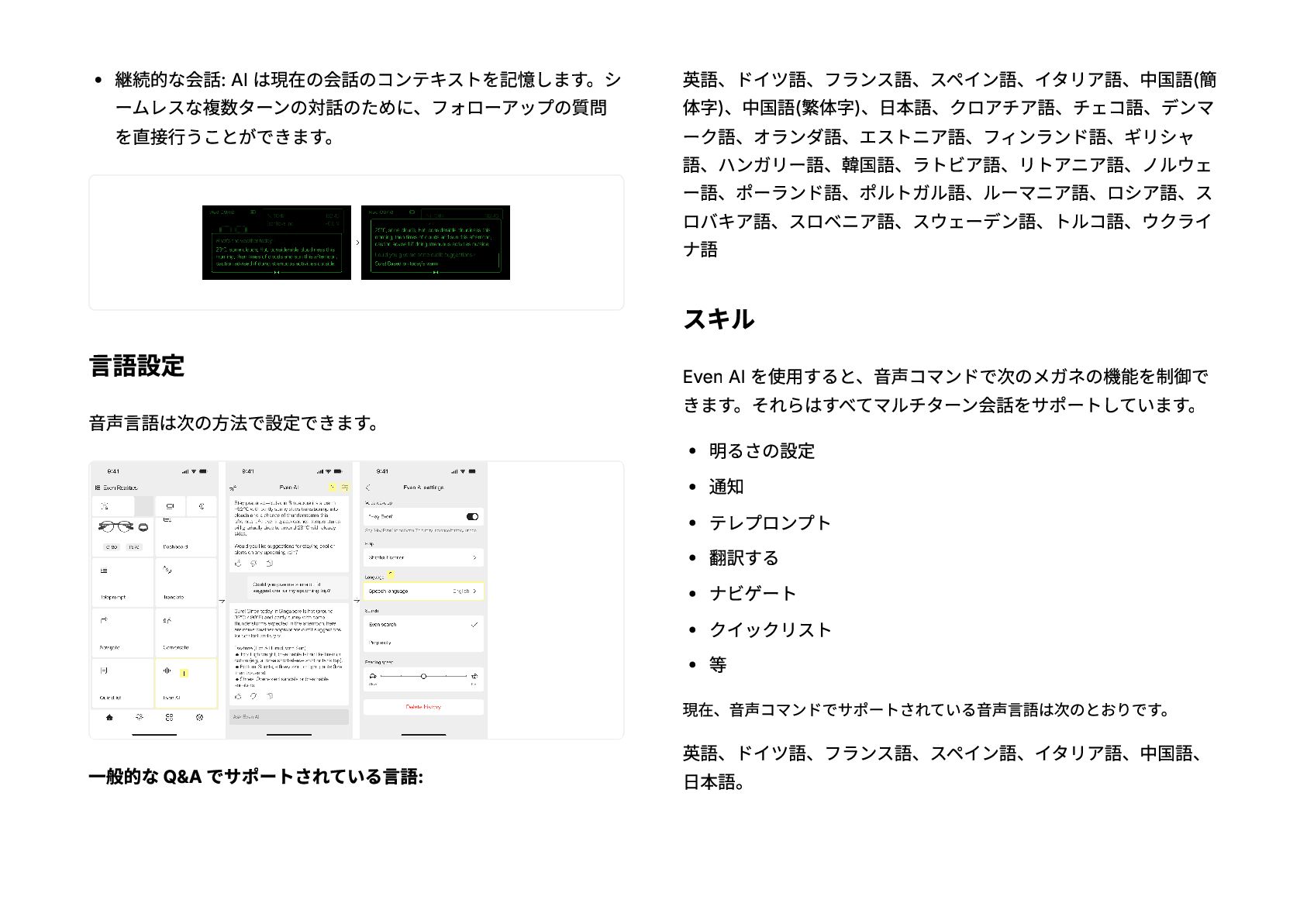英語、ドイツ語、フランス語、スペイン語、イタリア語、中国語(簡 体字)、中国語(繁体字)、日本語、クロアチア語、チェコ語、デンマ ーク語、オランダ語、エストニア語、フィンランド語、ギリシャ 語、ハンガリー語、韓国語、ラトビア語、リトアニア語、ノルウェ ー語、ポーランド語、ポルトガル語、ルーマニア語、ロシア語、ス ロバキア語、スロベニア語、スウェーデン語、トルコ語、ウクライ ナ語 スキル Even AI を使用すると、音声コマンドで次のメガネの機能を制御で きます。それらはすべてマルチターン会話をサポートしています。 明るさの設定 通知 テレプロンプト 翻訳する ナビゲート クイックリスト 等 現在、音声コマンドでサポートされている音声言語は次のとおりです。 英語、ドイツ語、フランス語、スペイン語、イタリア語、中国語、 日本語。