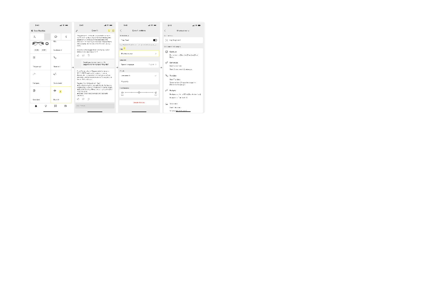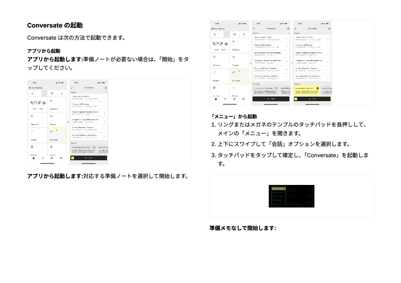 1. リングまたはメガネのテンプルのタッチパッドを長押しして、 メインの「メニュー」を開きます。 2. 上下にスワイプして「会話」オプションを選択します。 3. タッチパッドをタップして確定し、 「Conversate」を起動しま す。 準備メモなしで開始します:
