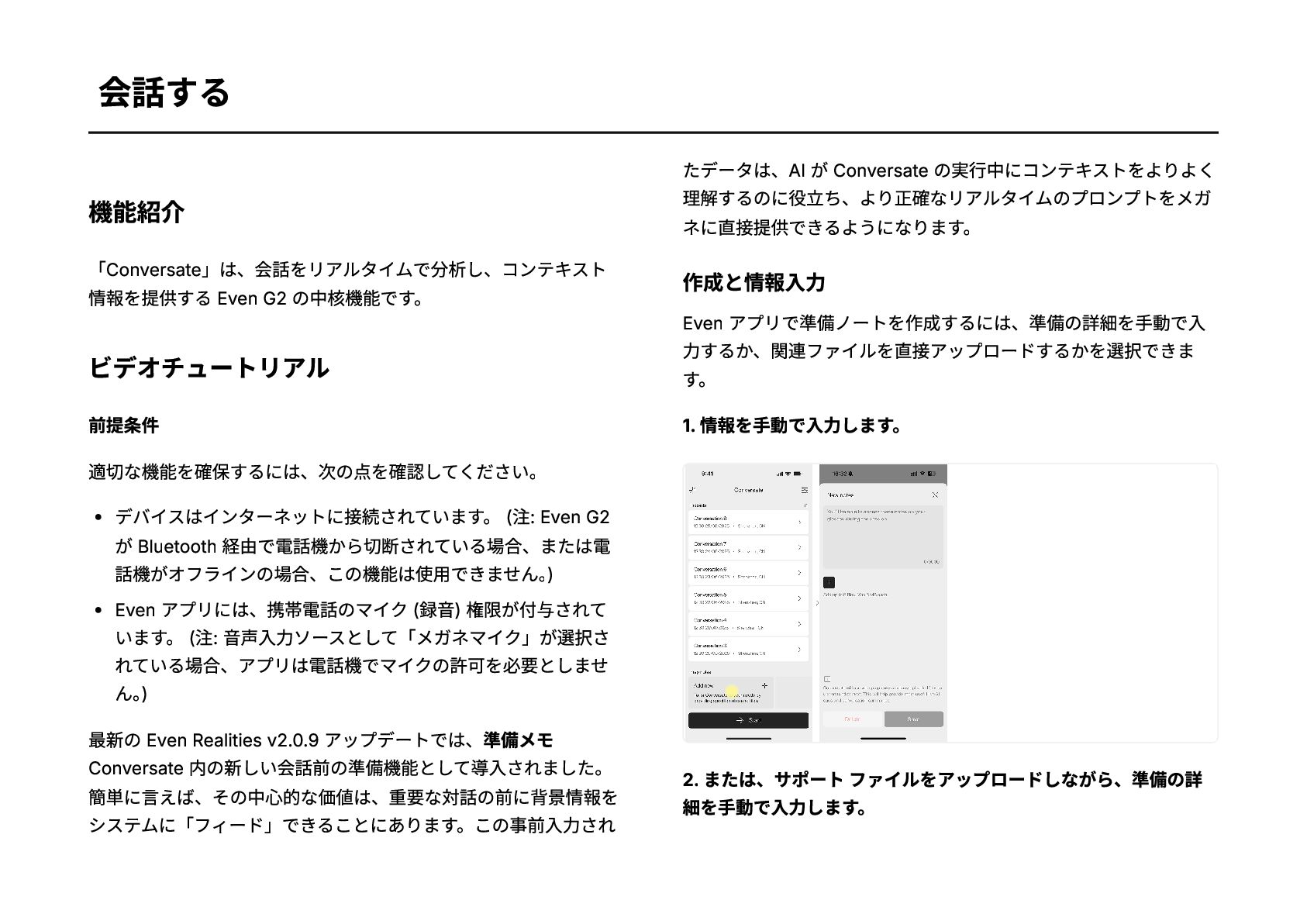 21. PDF_MARKER_9_ 会話する 機能紹介 「Conversate」は、会話をリアルタイムで分析し、コンテキスト 情報を提供する Even G2 の中核機能です。 ビデオチュートリアル 前提条件