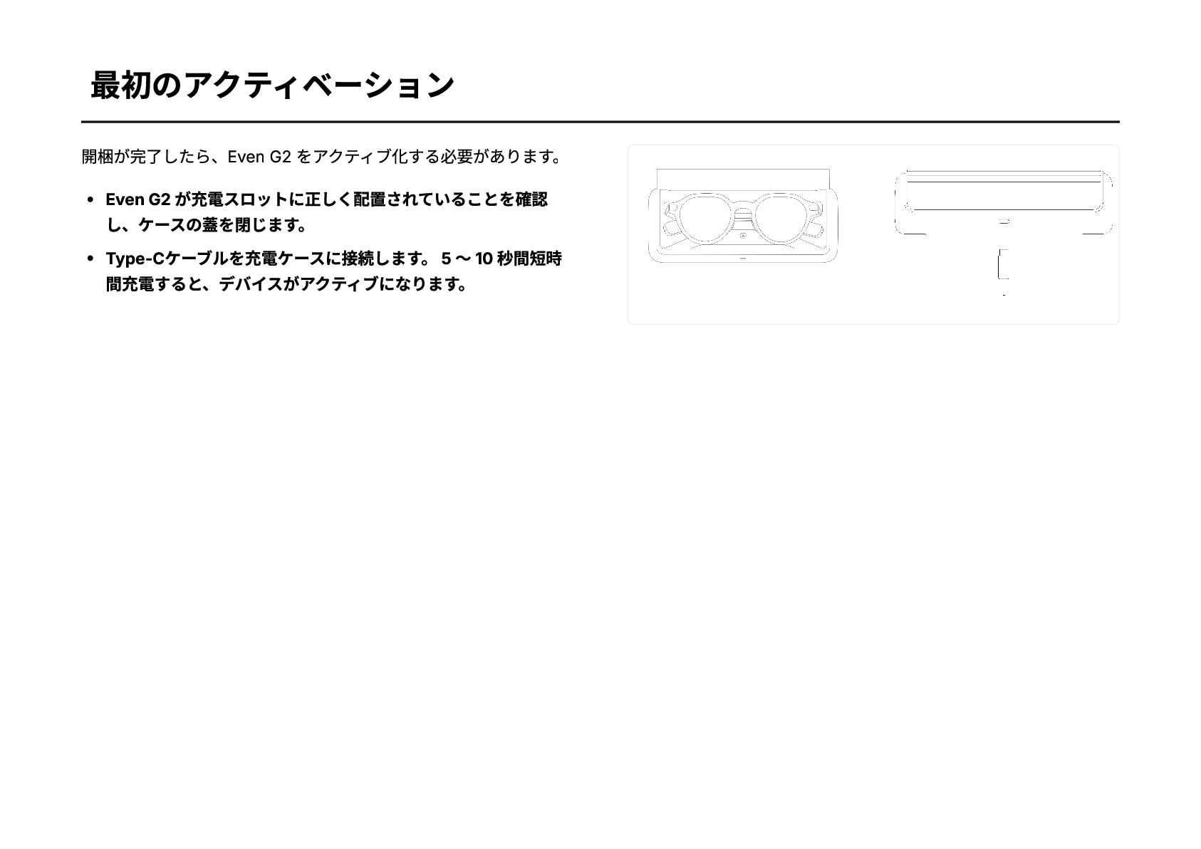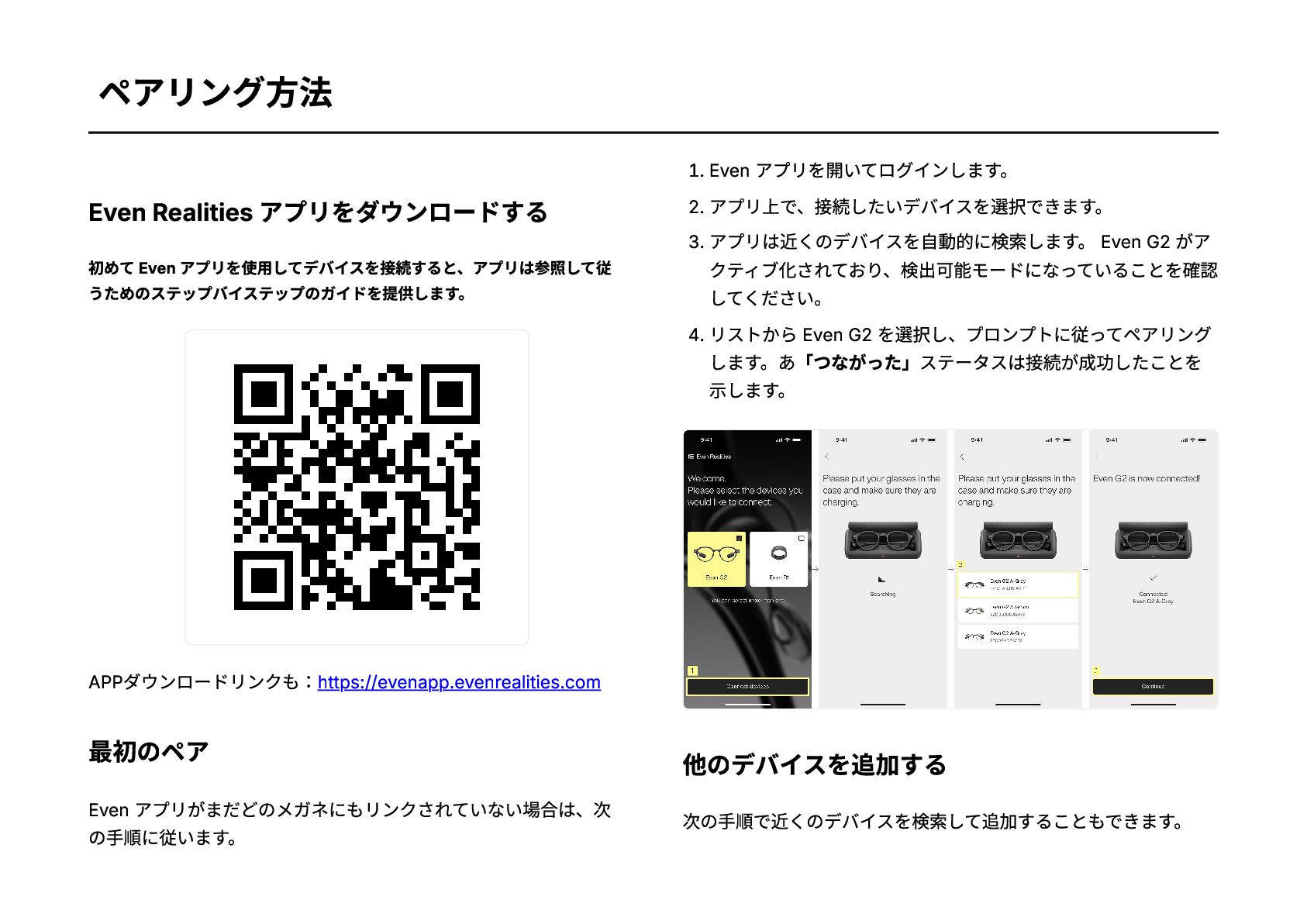アプリのダウンロードリンク: https://evenapp.evenrealities.com 最初のペア Even アプリがまだどのメガネにもリンクされていない場合は、次 の手順に従います。 1. Even アプリを開いてログインします。 2. アプリ上で、接続したいデバイスを選択できます。 3. アプリは近くのデバイスを自動的に検索します。 Even G2 がア クティブ化されており、検出可能モードになっていることを確認 してください。 4. リストから Even G2 を選択し、プロンプトに従ってペアリング します。あ「つながった」ステータスは接続が成功したことを 示します。