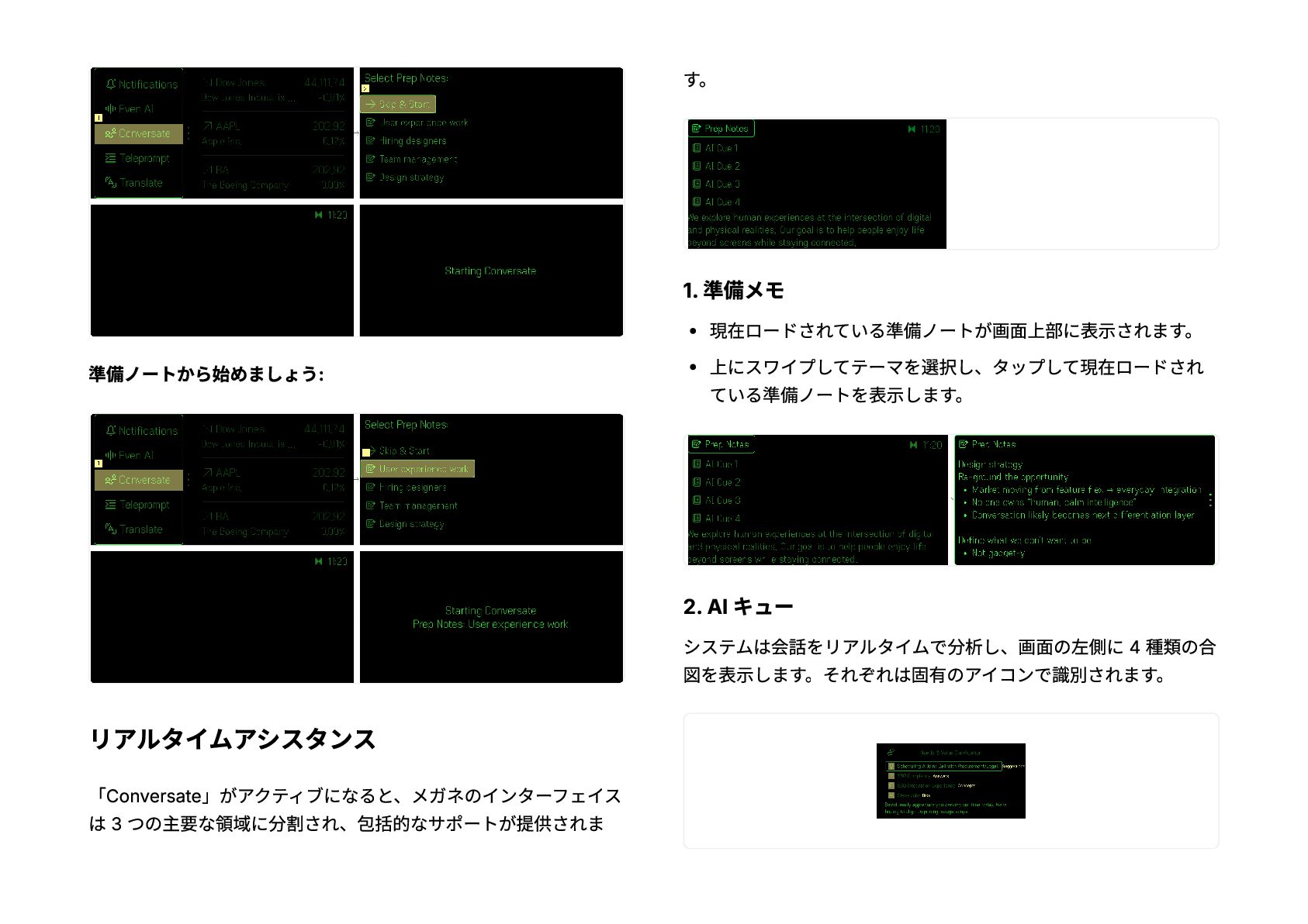 23. 準備ノートから始めましょう: リアルタイムアシスタンス 「Conversate」がアクティブになると、メガネのインターフェイス は 3 つの主要な領域に分割され、包括的なサポートが提供されま す。 1. 準備メモ 現在ロードされている準備ノートが画面上部に表示されます。